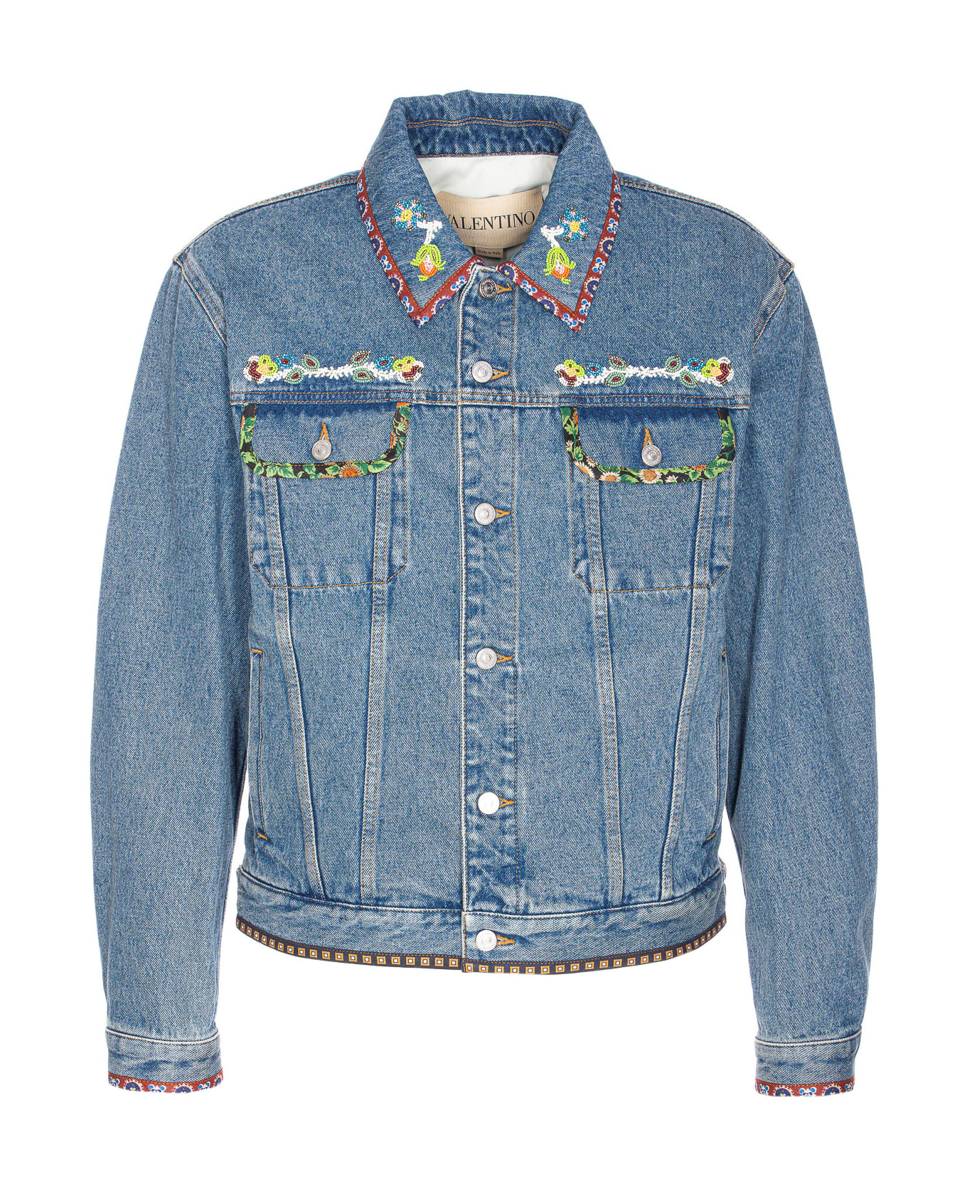 Valentino denim jacket with frontal buttons closure, regular collar, frontal pockets with button closure, lateral pockets, long sleeves, regular collar, beads details, edges with details, patch logo on the back Composition: 100% Cotton, 69% Polyester, 31% Cotton, 100% Polyester Made in: Italy Color: Blue Size and fit: - EU SIZE (IT) Model number: DC04QB0W558