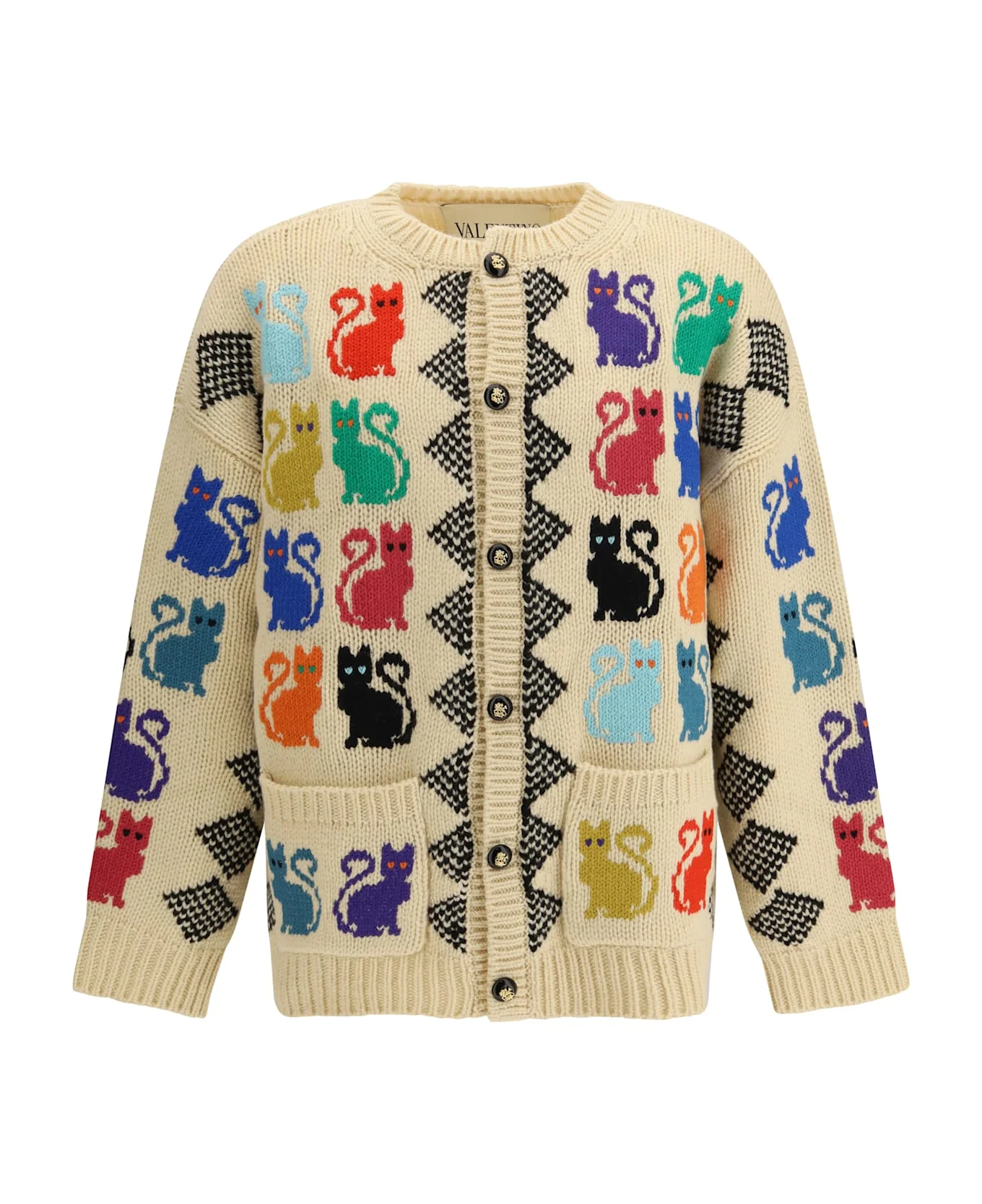 The wool cardigan by valentino featuring the le chat de la maison jacquard motif, blending playful charm with refined elegance. the gauge 3 knit enhances the soft texture and the richly detailed cat design. its loose fit offers fluidity and comfort, while the button closure adds a clean, effortless finish that makes the piece versatile and easy to style. Composition: 100% % Wool Made in: Italy Model number: 8V3KA06CBBKM12