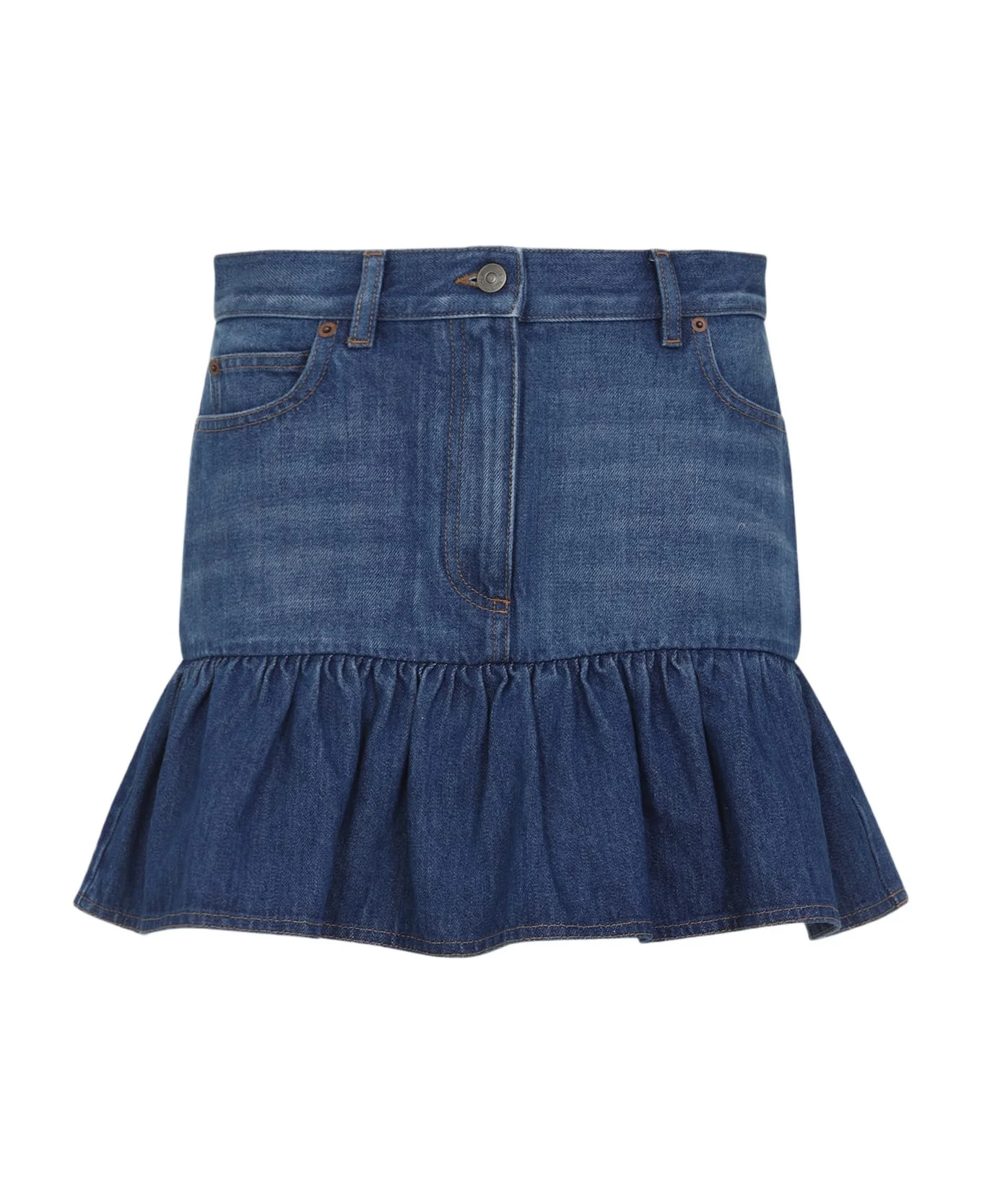 Valentino Blue Cotton Mini Skirt. Washed blue cotton denim, belt loops, 5-pocket construction, front button and fly-zip fastening, Chez Valentino leather label at the back waistband, ruffled hem. Made in: Italy Color: Medium Blue Denim Model number: 7B3DD20L9KH558