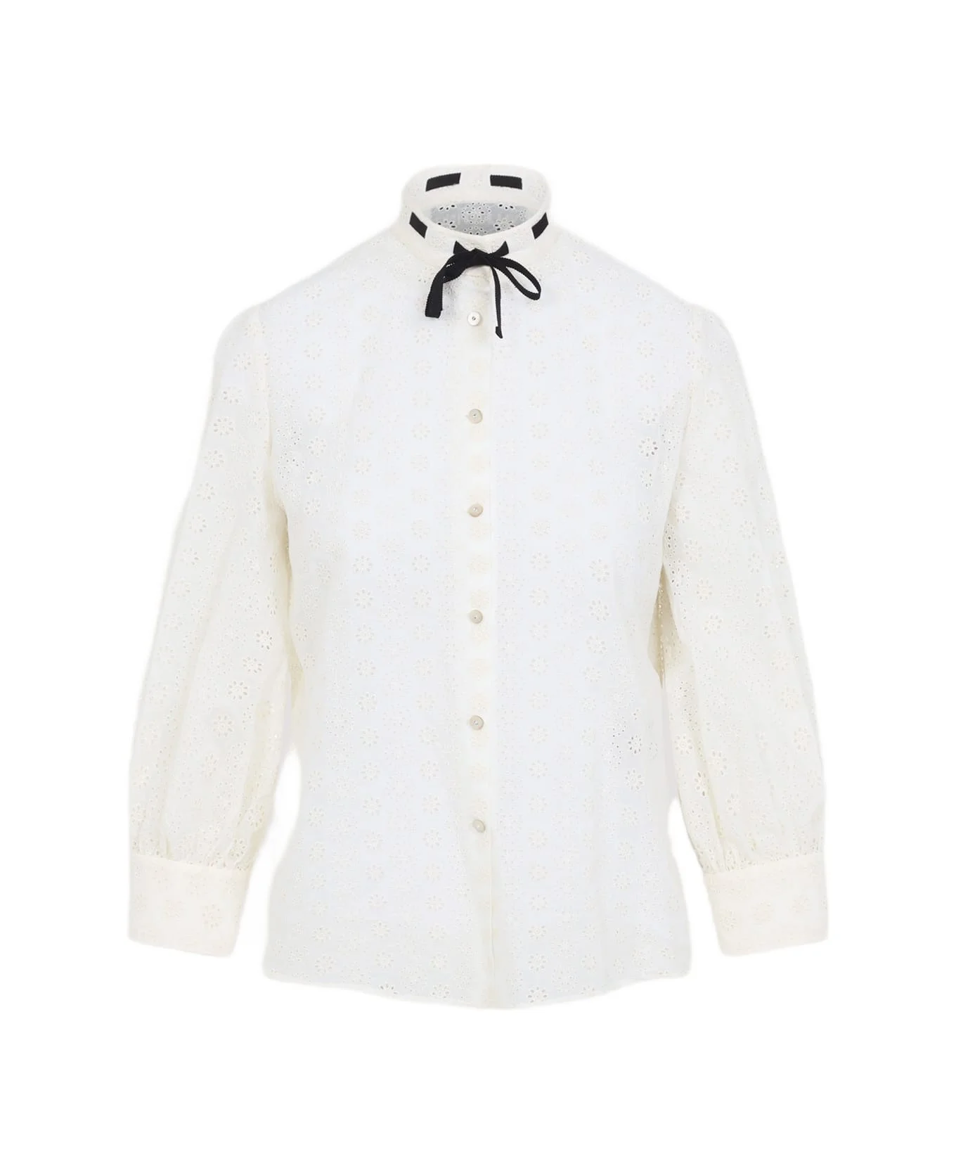 Valentino Ivory Cotton Shirt. Ivory Sangallo cotton, Korean collar with black lace detail, front button fastening, balloon long sleeves, back yoke, round hem. Made in: Italy Color: Avorio Model number: 7B3AB7P39EUA03