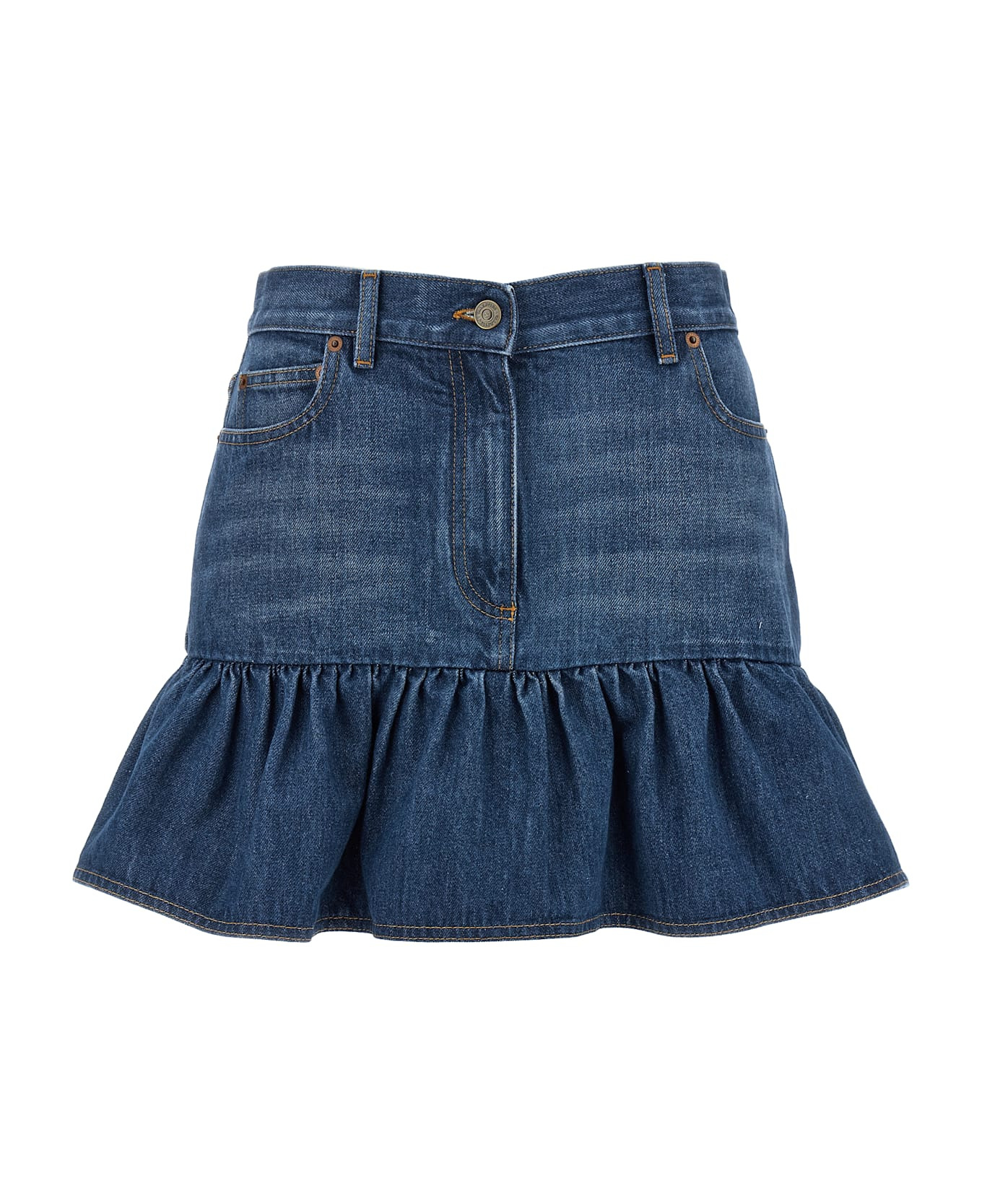 Cotton denim mini skirt, belt at the waist with loops, zip and button closure, flounce on the bottom, back leather logo tag, pockets. Composition: 100% cotton Made in: Italy Color: Light Blue Size and fit: - True to size fit Model number: B3DD20L9KH558