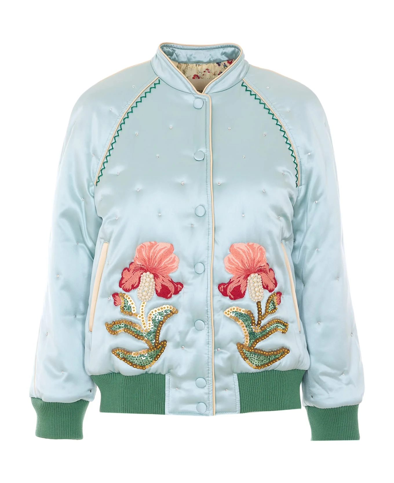 Valentino Garavani light blue and green jacket with frontal buttons closure, crewneck, long sleeves, lateral pockets, embellished strass and sequins details, padded Composition: 100% Silk, 100% Acetate, 90% Cotton, 8% Polyamide, 2% Elastane Made in: Italy Color: MultiColour Size and fit: - EU SIZE (IT) Model number: CI1758M69VC
