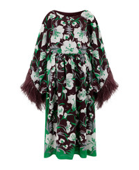 Long dress characterized by a lively floral pattern on a dark background. the bell sleeves and the ostrich feather inserts add a touch of elegance and femininity. the shades range from green, white, and burgundy, creating an elegant and refined effect. the lower part features a green trim that adds an additional touch of color. made from lightweight fabric, this dress is ideal for casual events or special occasions. the loose silhouette offers comfort and freedom of movement. perfect to pair with minimalist accessories for a sophisticated look. 100% silk, 91% viscose, 9% elastane Composition: 100% % Silk, 91% % Viscose, 9% % Elastane Made in: Italy Color: Multicolor Model number: XB0VAUQ2773PNG