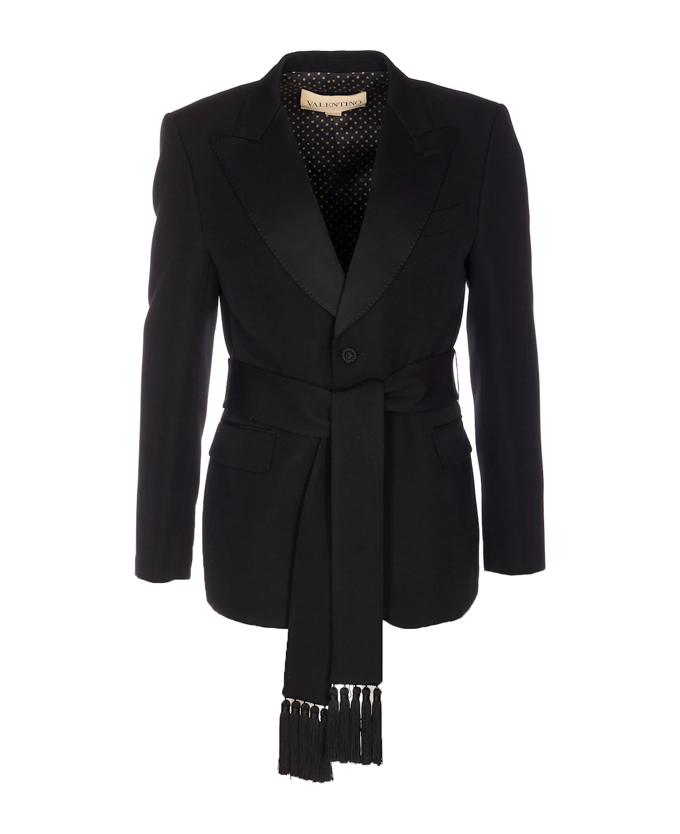 Valentino Garavani black jacket, buttons on the front, V-neck, long sleeves, buttons on cuffs, sash on waist with fringes details, pockets Composition: 100% Virgin Wool, 100% Polyester, 53% Flax, 30% Wool, 15% Viscose, 2% Polyester, 100% Viscose Made in: Italy Color: Black Size and fit: - EU SIZE (IT) Model number: CEI87AK80NO