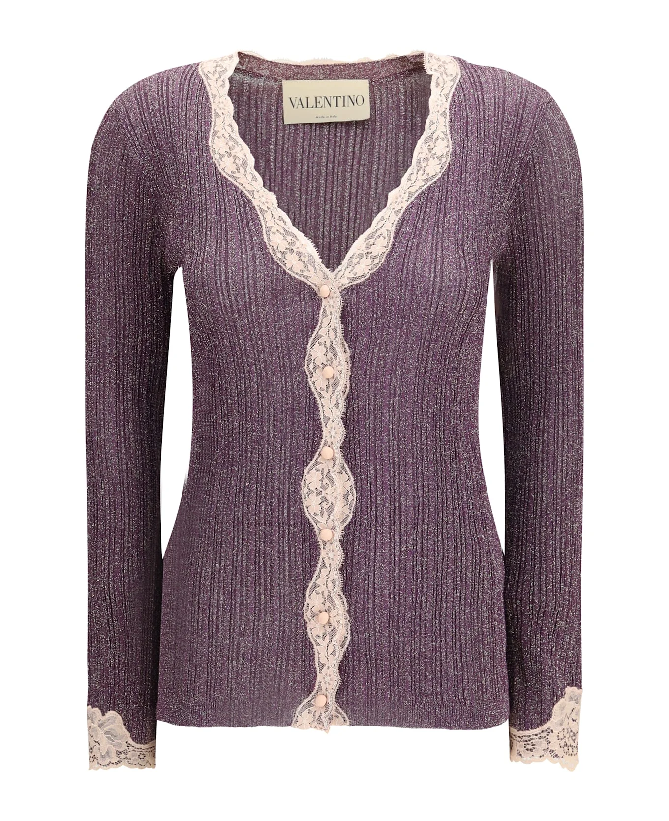 The lurex knit cardigan with lace by valentino features an elegant and feminine design. crafted in lurex knit, it is enhanced with lace details and finished with a front button closure, creating a refined and luminous look. Composition: 81% % Viscose, 19% % Other Fibres Made in: Italy Model number: 8B0KA15KA8TF8S