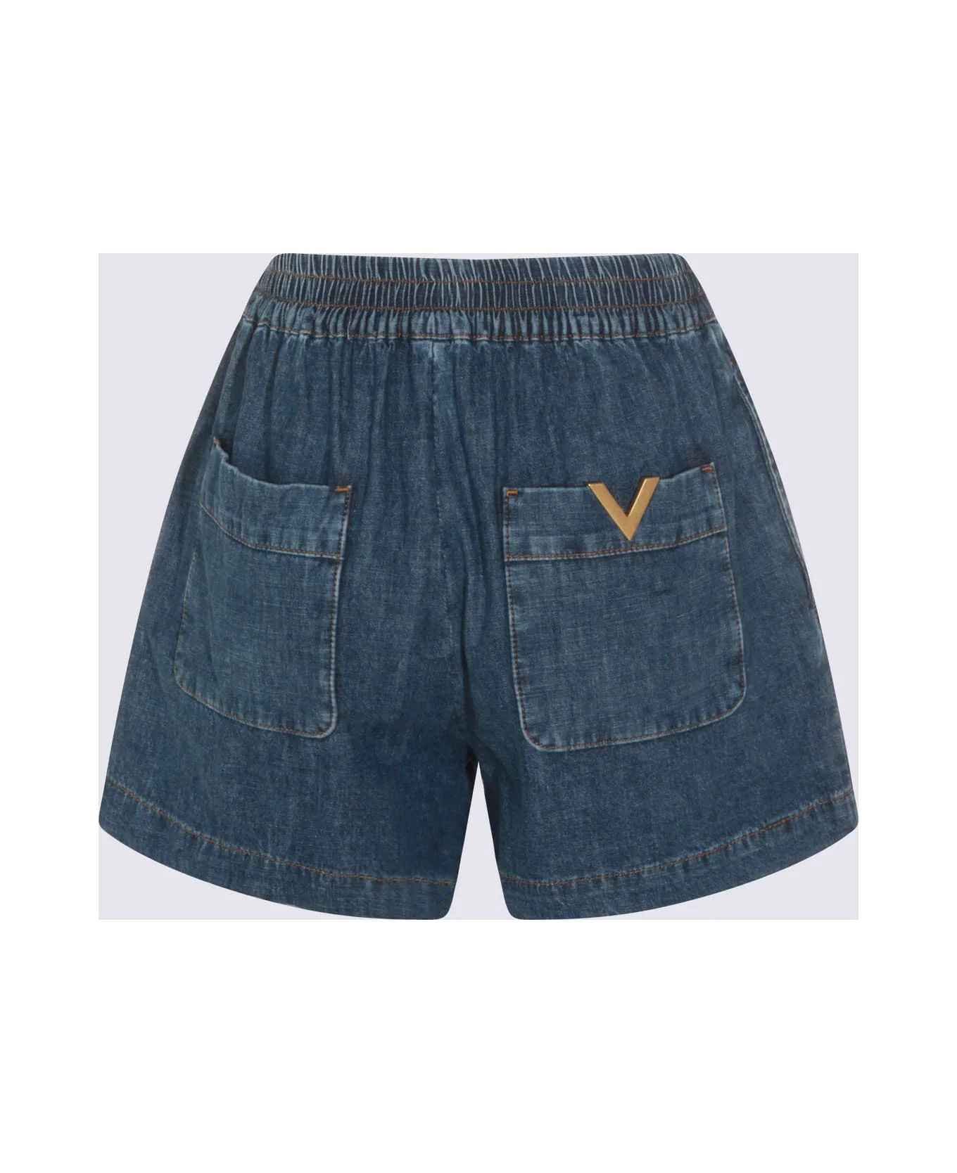 Medium denim VLogo shorts from Valentino featuring elasticated waistband, back pockets and gold metal V detail at pocket. Composition: 100% Cotton Made in: Italy Color: MEDIUM BLUE Model number: 8B3DD5509YA558
