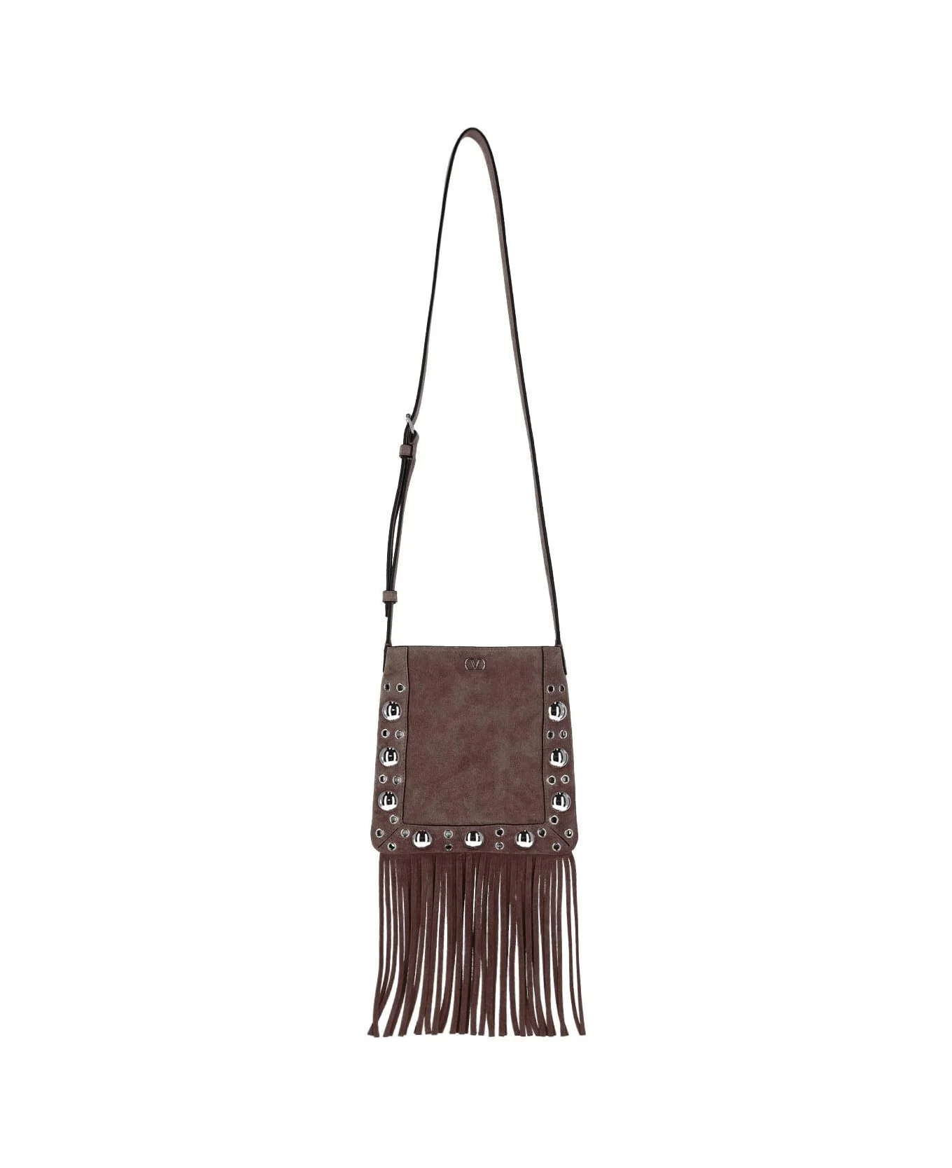 Valentino Garavani Nellcote small shoulder bag in dark brown suede with adjustable shoulder strap, silver metal VLogo Signature logo on the front, silver metal studs on the front and back, fringes on the bottom, and a single inner compartment. Composition: 100% Calf Leather Made in: Italy Color: Brown Size and fit: - A 20 X L 20 X P 3 cm Model number: 8W2B0R34JET0TO
