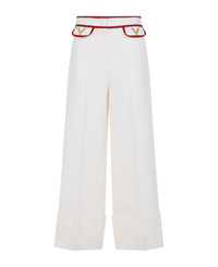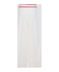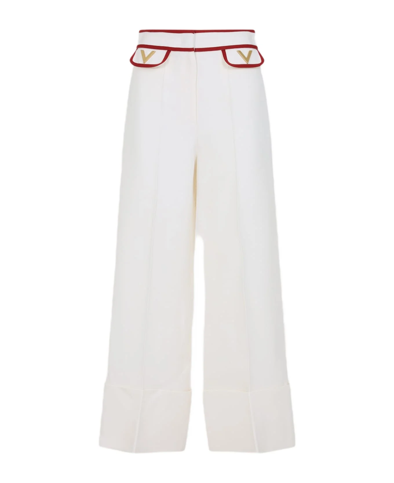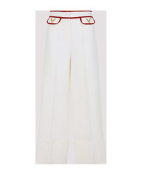 Valentino Ivory White Virgin Wool Pants. Crafted in virgin wool and silk. Front concealing zipped and hooked fastening, side flap details with red edges, side gold-tone metallic signature V logo, wide leg, straight hem. Made in: Italy Color: Avorio Model number: 7B3RB6541CFAS0