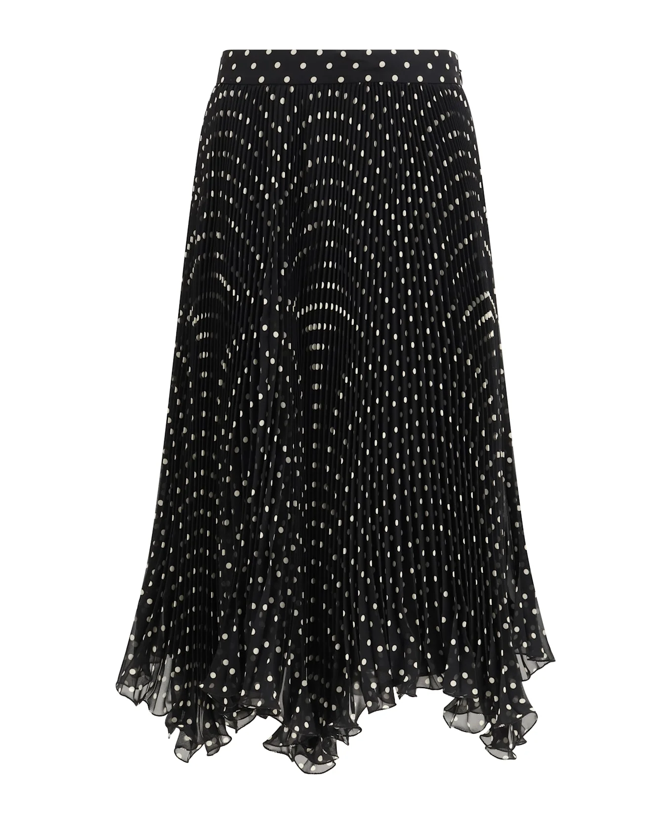 The polka-dot silk skirt by valentino delivers a refined, feminine elegance. defined by an all-over polka-dot motif, it features pleated detailing that adds movement and lightness to the silhouette. an asymmetric hem introduces a contemporary touch, while a hook-and-concealed zip closure ensures a clean, streamlined finish. Composition: 91% % Viscose, 9% % Elastane Made in: Italy Model number: 8B3RAEL59ABTB1