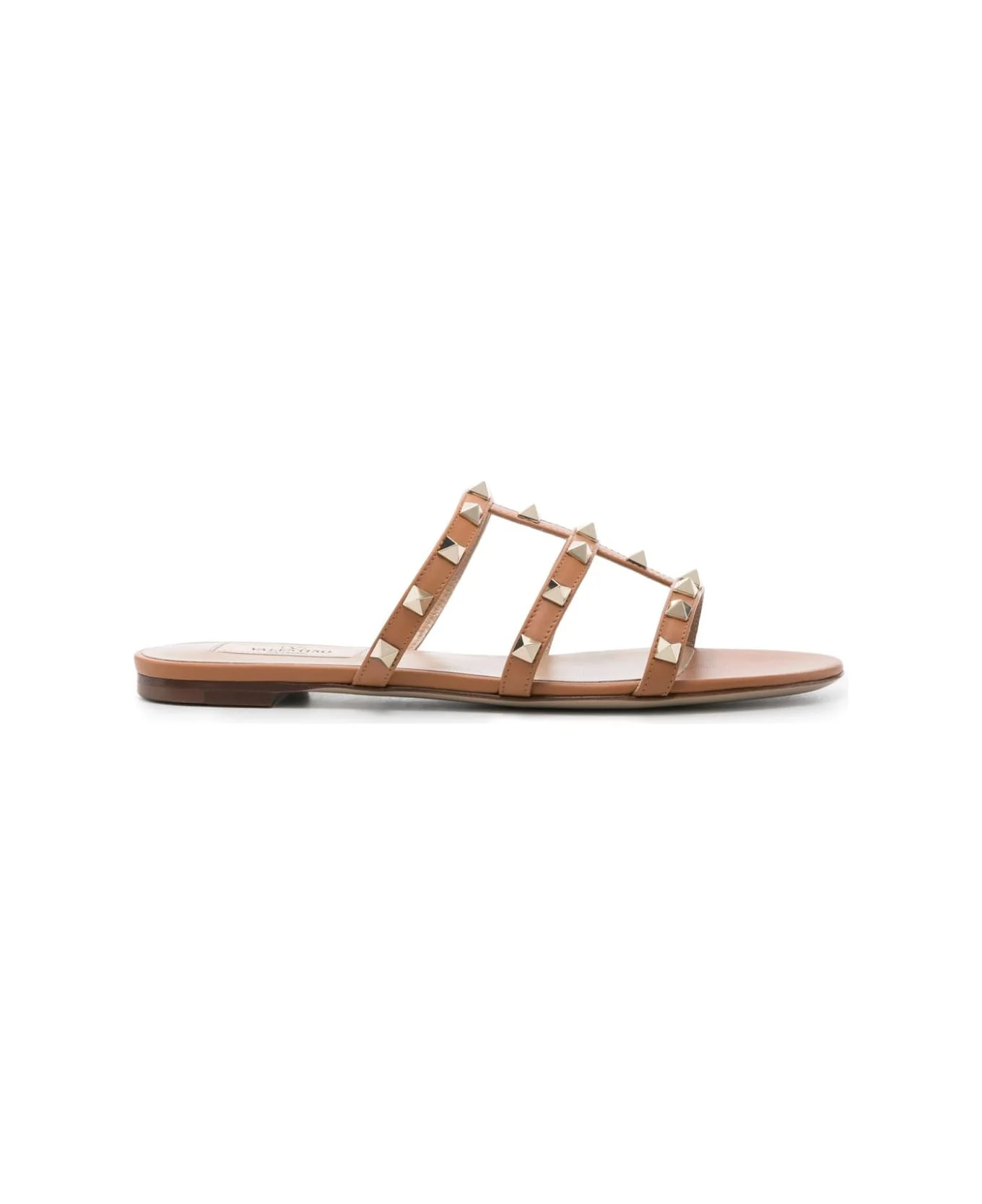 camel brown calf leather smooth grain open toe gold-tone Rockstud embellishment caged design branded leather insole flat leather sole slip-on style Composition: Calf Leather, 100% Made in: Italy Color: Leather Brown Model number: WS0C49VODKEL