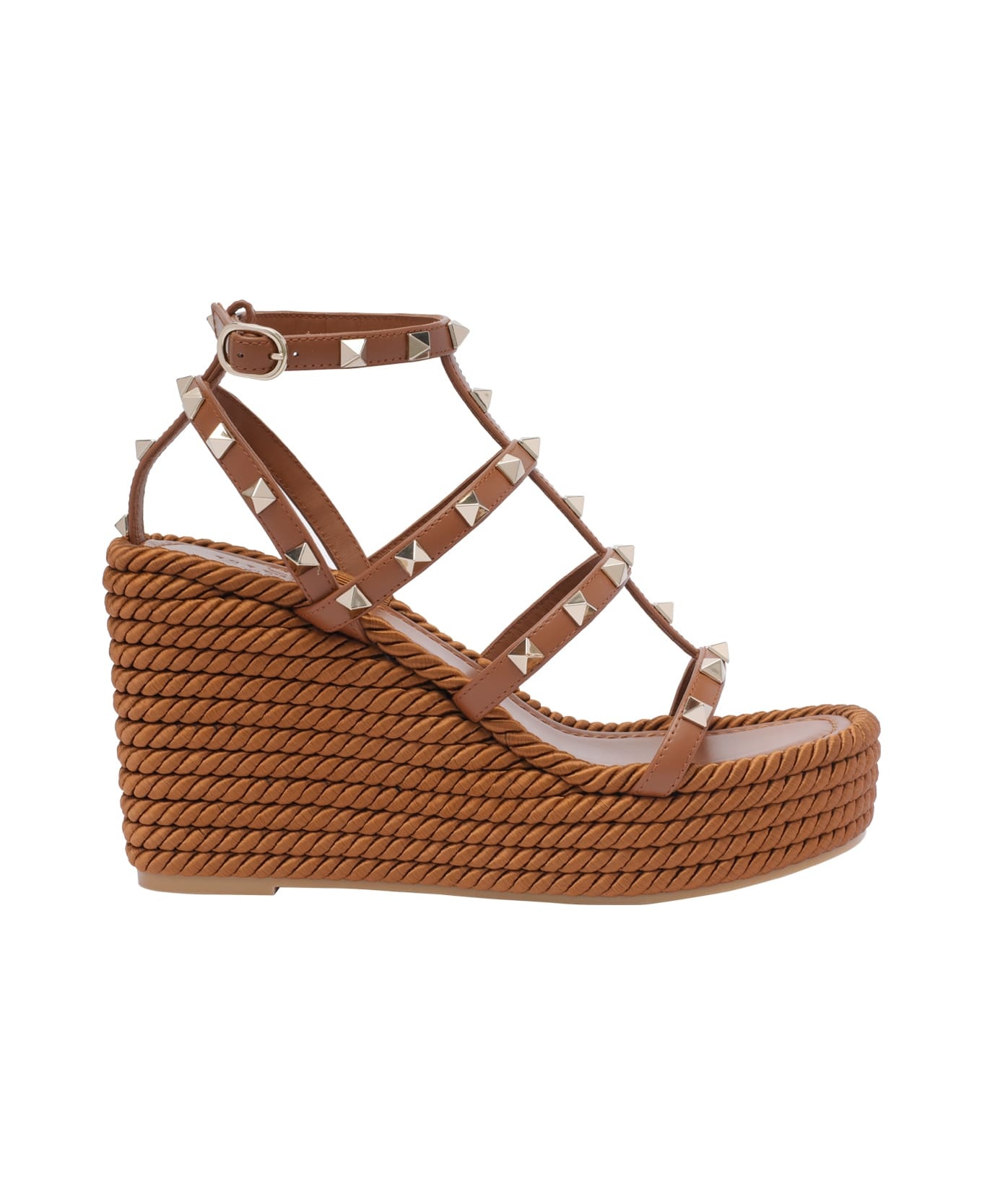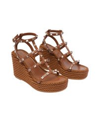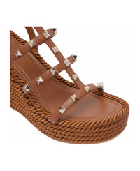 Valentino Garavani brown wedged sandals, rockstud model, leather upper and rubber sole, adjustable buckle closure, gold studs, rafia platform Composition: 100% Calf Leather/rubber Sole Made in: Italy Color: Brown Size and fit: - Heel: 9,5 cm Model number: S0F95BAEN58