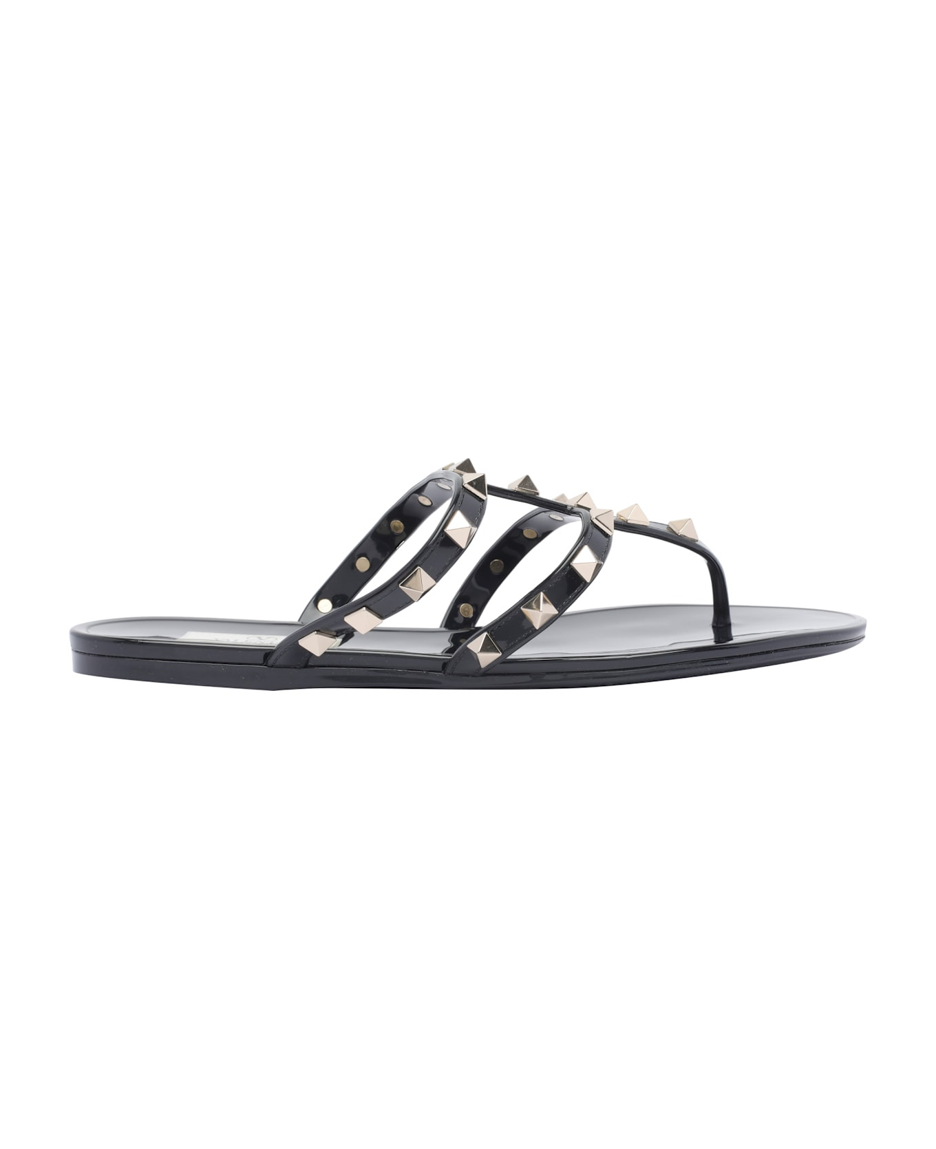 Valentino Garavani black Rockstud flat rubber sandal, leather upper, studs logo details, open round toe Composition: 100% Rubber/rubber Sole Made in: Italy Color: Black Size and fit: - EU SIZE (IT) Model number: S0T84PVS0NO
