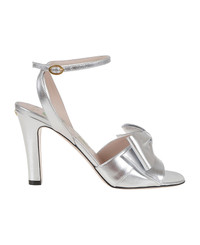 Bowow kid leather sandal by VALENTINO GARAVANI. Adjustable ankle strap; custom insole with floral motif. Featuring a bow detail and antique brass-finish VLogo Signature on the heel. Made in: Italy Color: Silver Size and fit: - Heel 9,5 cm Model number: WS0MA6KDRS13