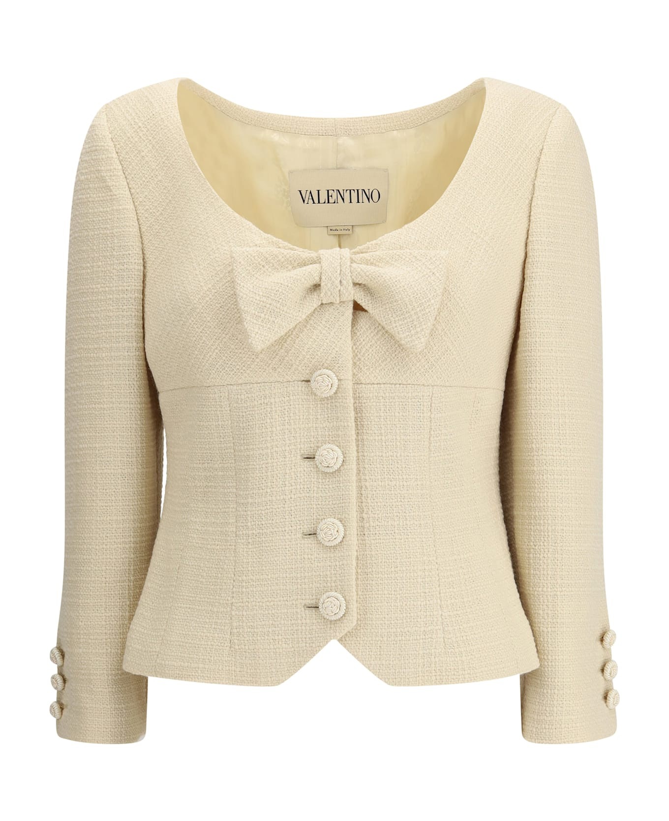 The short jacket in plain wool tweed by valentino captures classic elegance with a romantic twist. the structured fabric enhances the compact silhouette, enriched by a wide neckline that balances femininity and poise. the front soutache button fastening adds a refined sartorial detail, while the bow introduces a delicate and distinctive accent. a sophisticated piece, ideal for completing elegant looks. Composition: 97% % Fleece Wool, 3% % Polyamide, 74% % Acetate, 26% % Silk Made in: Italy Model number: 7B0CE4X590YDC4