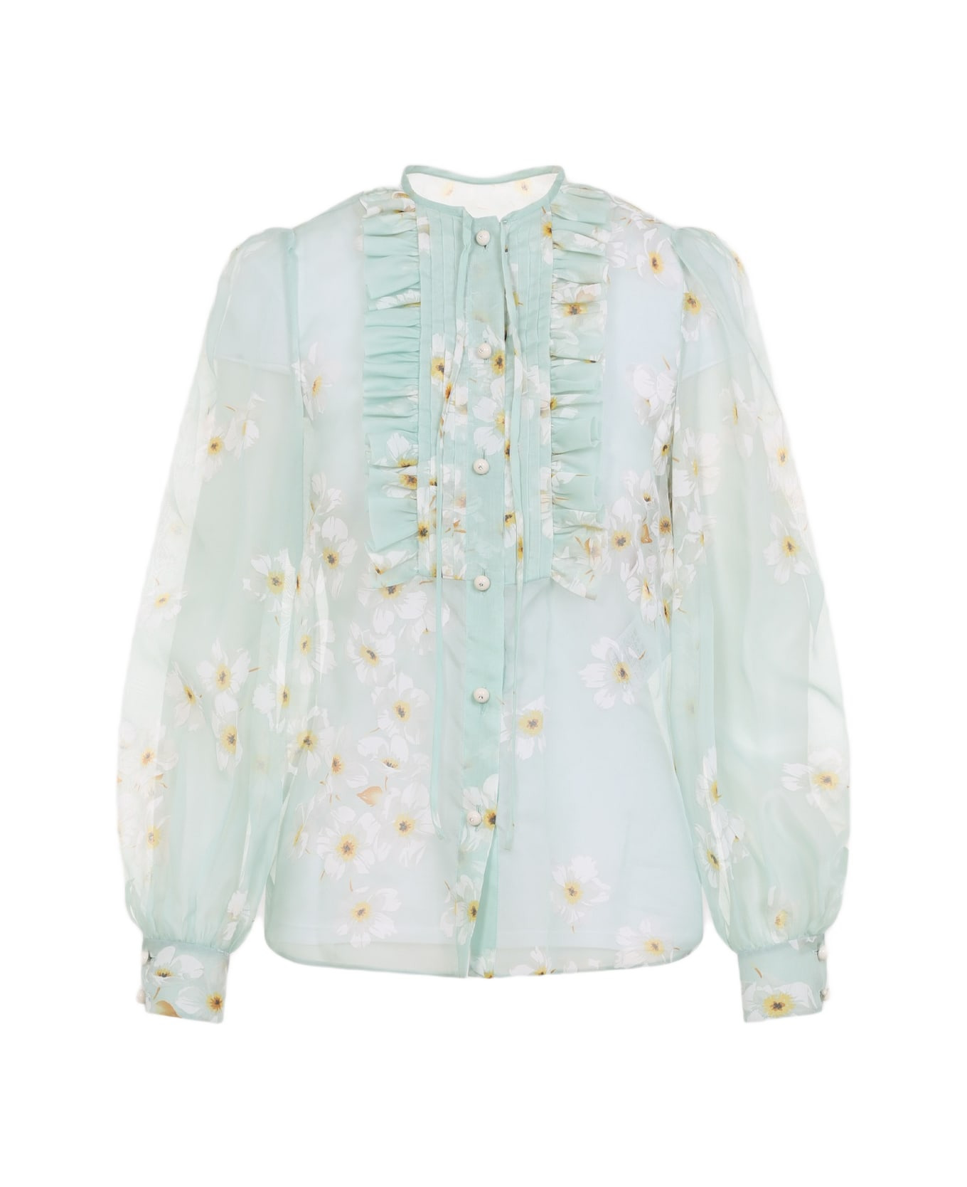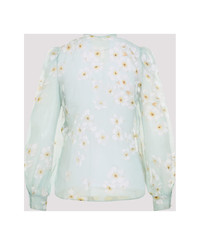 Valentino Light Blue Silk Shirt. Light blue semi-sheer silk, floral print all over, round neckline with self-tie fastening, frilled and pleated inserts on the breast, front button fastening, balloon long sleeves, buttoned cuffs, straight hem. Made in: Italy Color: Dirty Sage Multicolor Model number: 6B3AB792952QM1