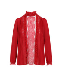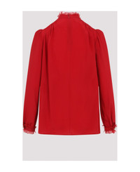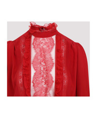 Valentino Red Silk Shirt. Pure red silk, ruffles at the collar, front lace, ruffles and semi-sheer detail, long sleeves, embroidery at the cuffs, back hook and concealed zip closure, straight hem. Made in: Italy Color: M Paris Model number: 6B3AEAD590FR9M