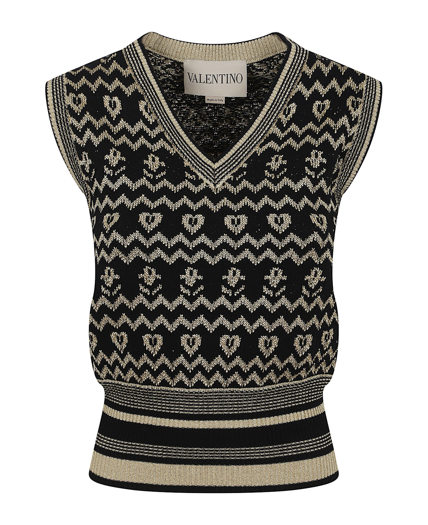 Wool vest by VALENTINO GARAVANI. V-neck; sleeveless; regular fit; ribbed elastic trim. Featuring contrasting metallic designs. Made in: Italy Color: Nero Gold Size and fit: - Regular fit, recommend you get your regular size Model number: BKM06C9H0G14