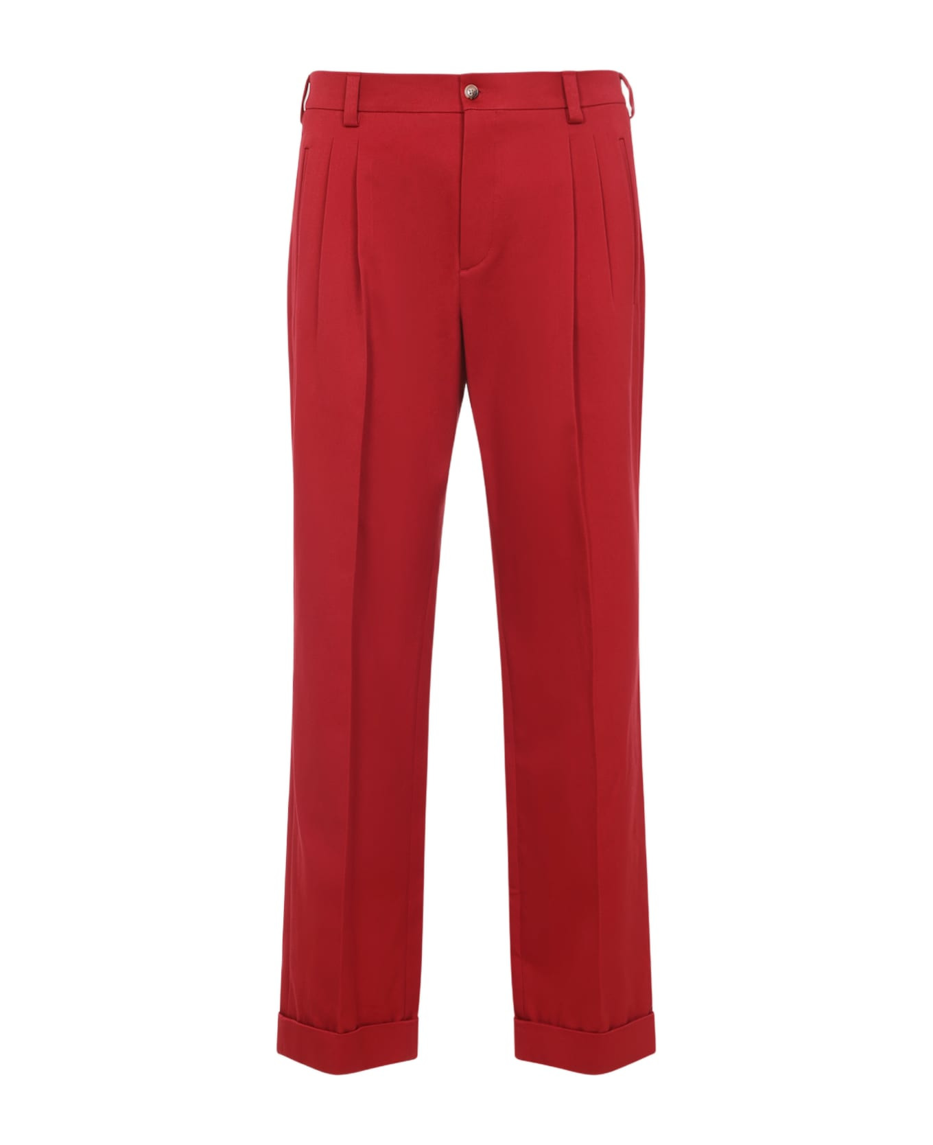 Valentino Raspberry Red Cotton Trousers. Pure rasberry red cotton trousers, front concealing zipped fastening, front buttoned fastening, belt loops, side pockets, front pleated design, back slit pockets, back gold-tone metallic signature V-logo detail, rolled-up hem, tonal stitching. Made in: Italy Color: Raspberry Model number: 7V3RBN30AWU1R0