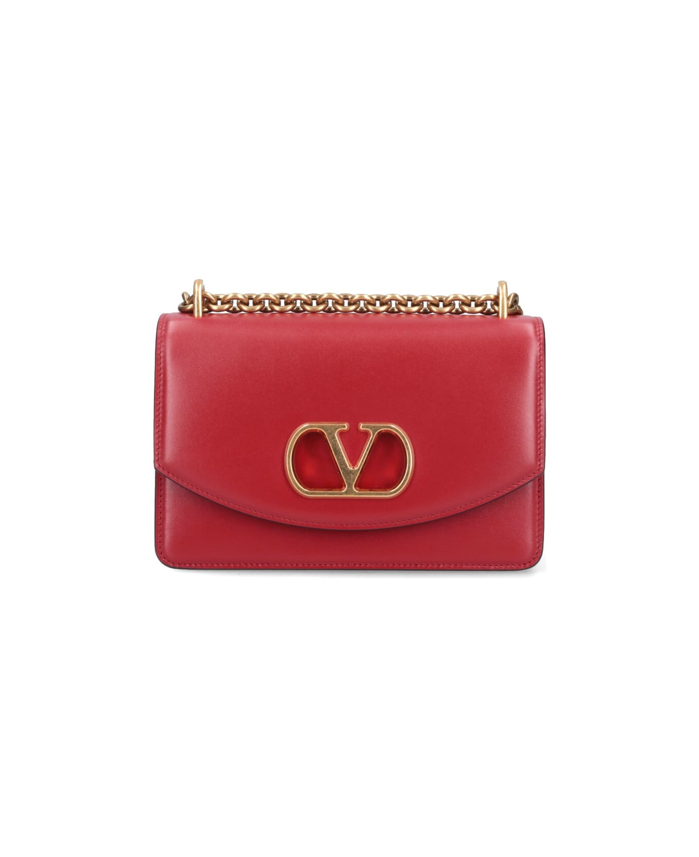 Valentino Garavani 'Vain' small shoulder bag, in shiny red leather, golden metallic chain shoulder strap, magnetic flap closure, golden metallic VLogo Signature logo detail, one interior flat pocket, one interior zip pocket, two separate interior compartments. Composition: 100% Leather Made in: Italy Color: Red Size and fit: - W A 13 x H L 19.5  x D cm handle x P  Model number: 6W2B0R17GCB0RO