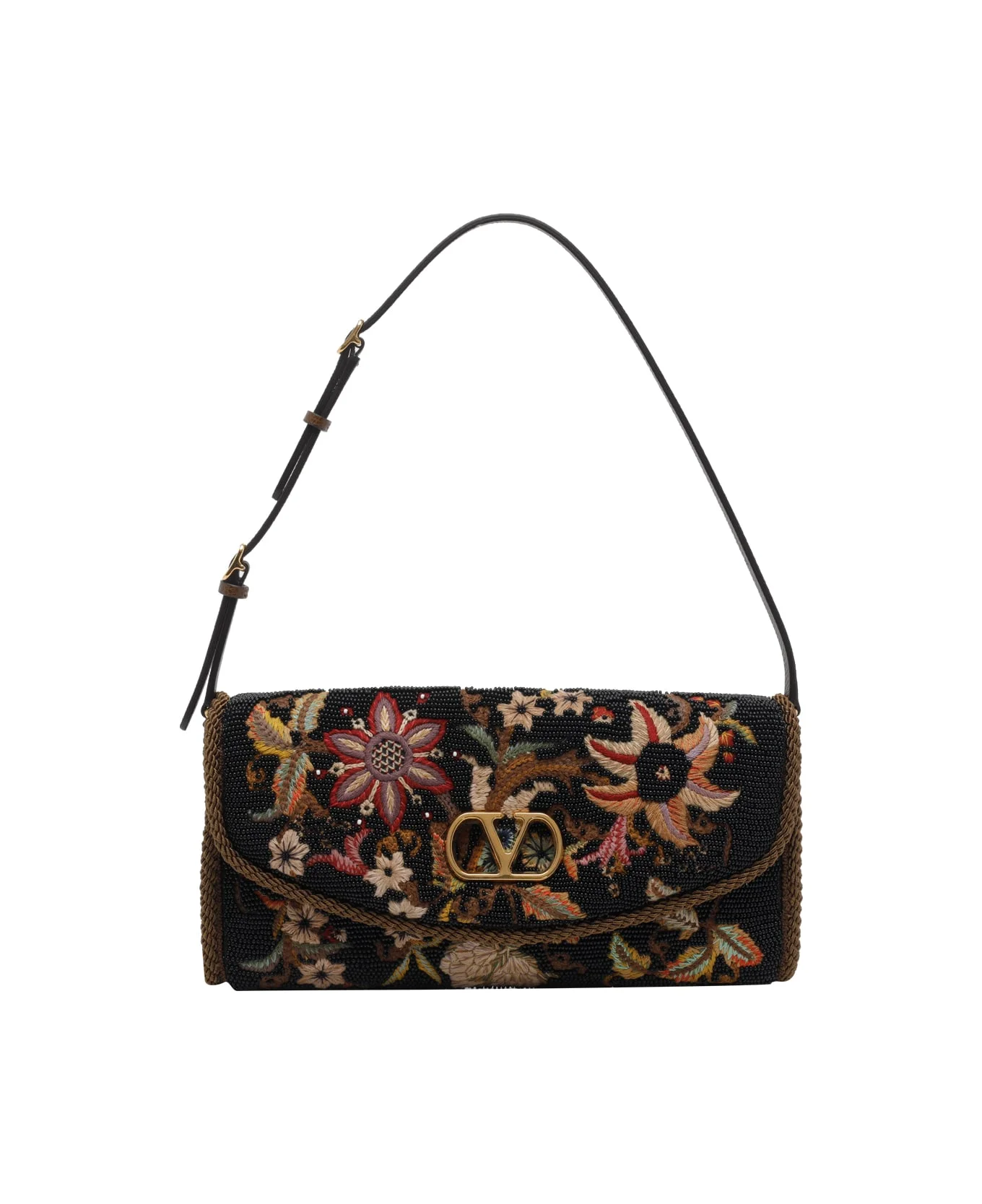 VALENTINO DEVAIN EMBROIDERED SMALL shoulder bag, magnetic closure, one inner slot, adjustable handle Composition: 100% Fabric, 100% Brass Made in: Italy Color: Black Size and fit: - 12,5x26x4 cm Model number: B0T31LTTDEY