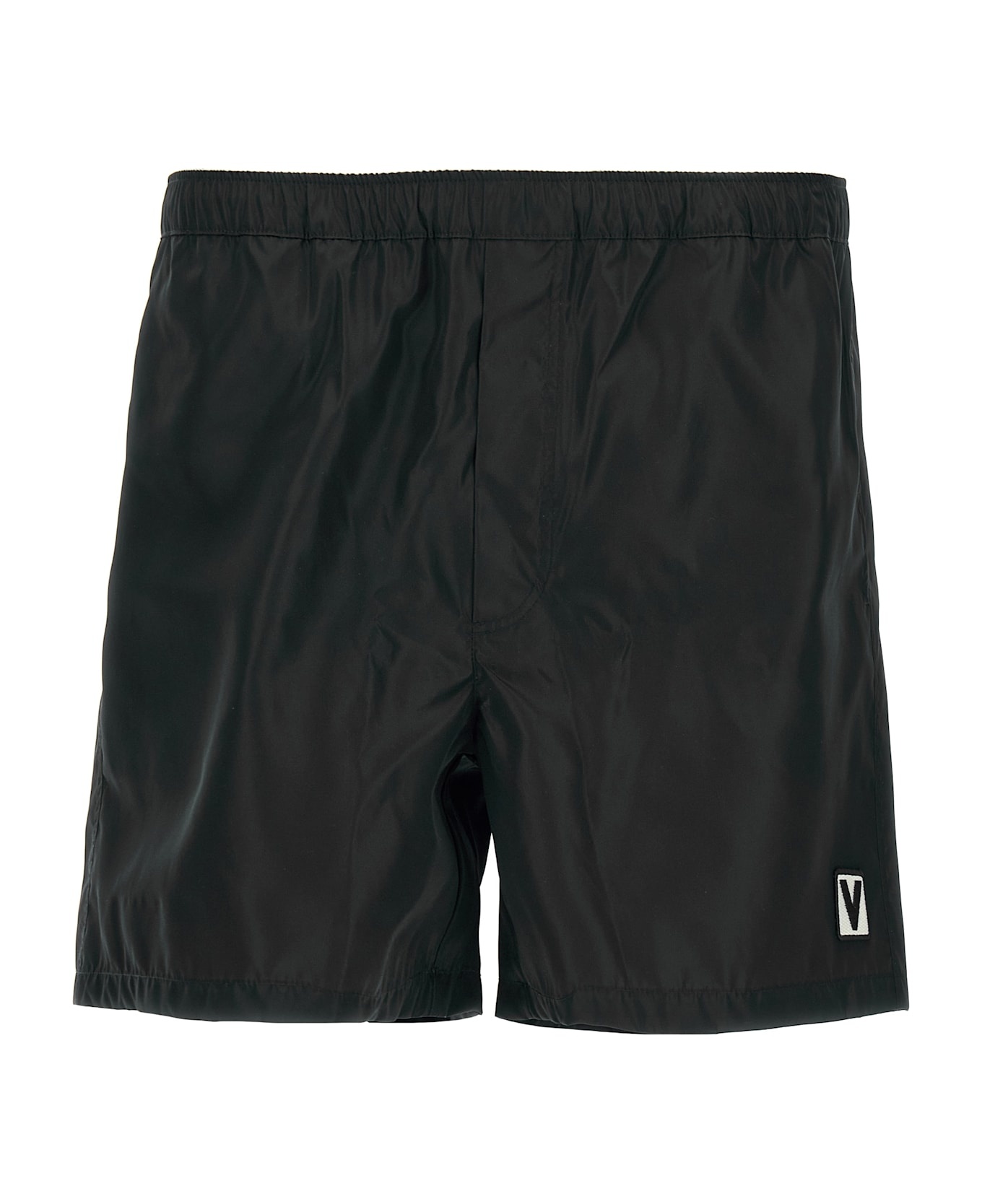 Nylon swimsuit with front 'Chez Valentino' patch, adjustable drawstring elastic at the waist, pockets, trompe l'oeil flap, inner mesh briefs. Composition: 100% polyamide Made in: Italy Color: Black Size and fit: - true to size fit Model number: V3UHA286FN0NO