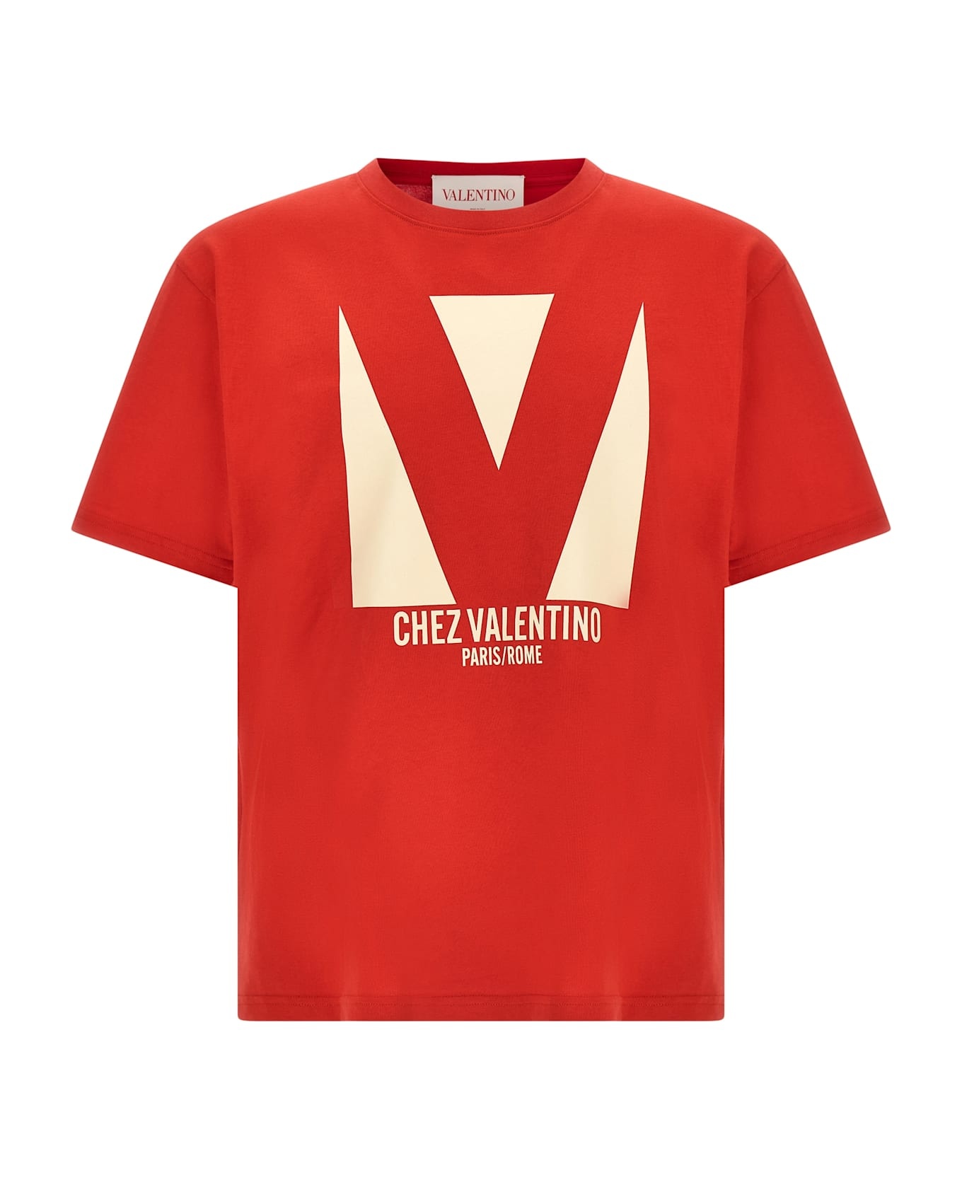 Cotton T-shirt with front 'Chez Valentino' print, crew neck, short sleeves. Composition: 100% cotton Made in: Italy Color: Red Size and fit: - true to size fit Model number: V3MG16PAQ9157