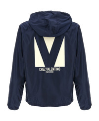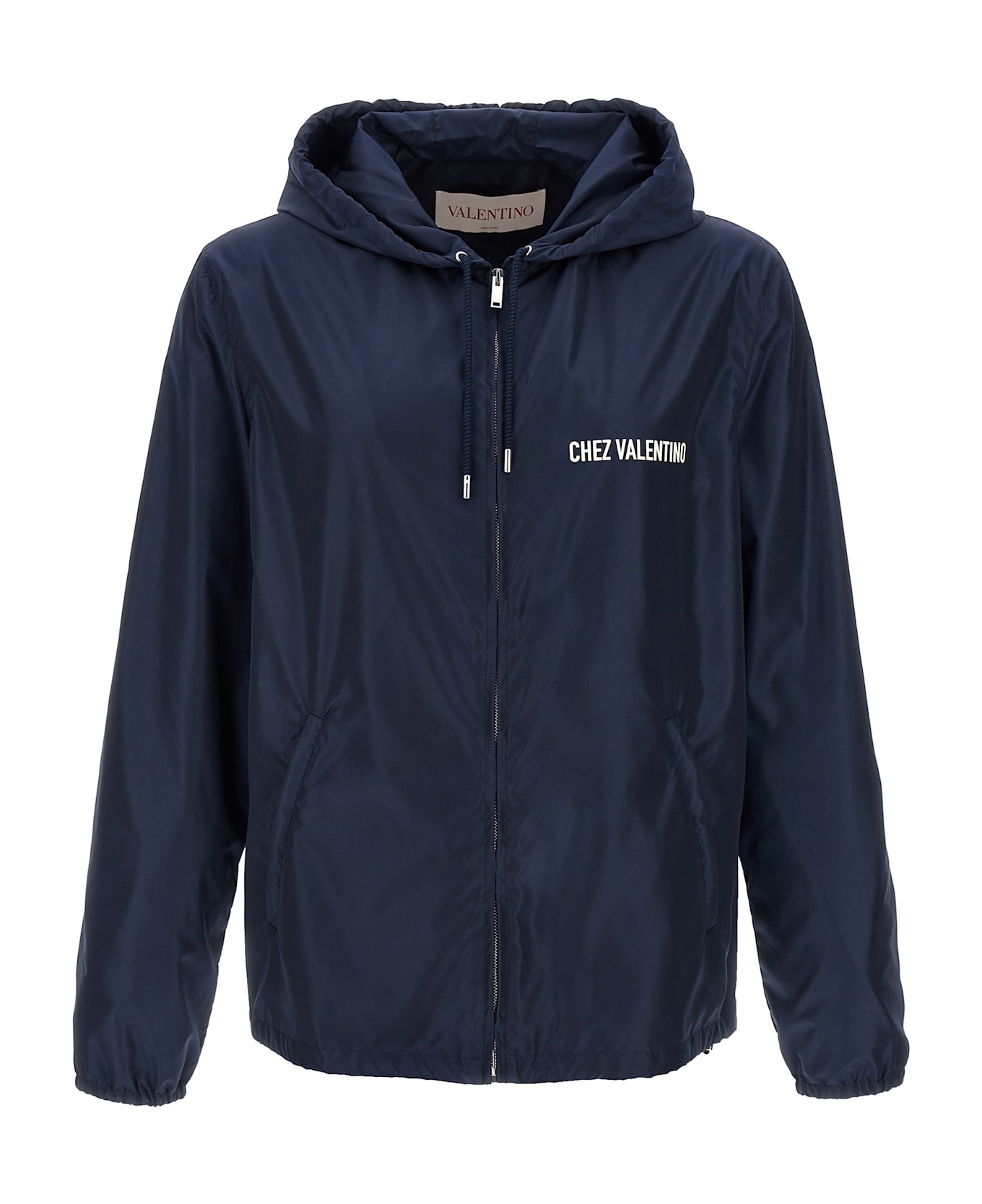 Nylon anorak with 'Chez Valentino' print on the front and back, hood with adjustable drawstring, zip closure, pockets, long sleeves with elastic cuffs, drawstring at the hem. Composition: 100% polyamide Made in: Italy Color: Blue Size and fit: - Slim fit Model number: V3CI3486FNAF9