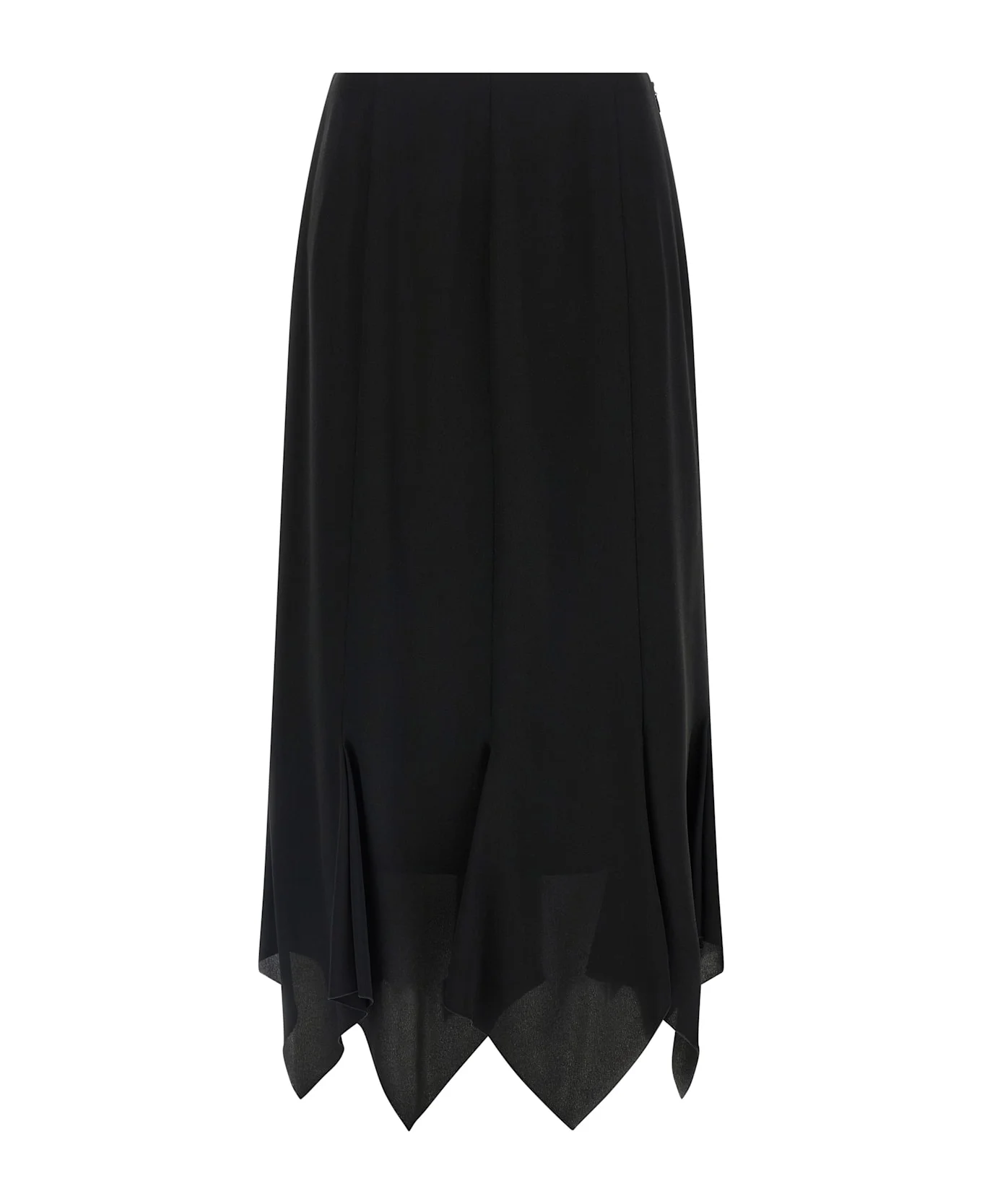 Midi skirt in crepe de chine with lining, flared silhouette with tone-on-tone inserts on the hem, side zip closure, and asymmetrical hem. Composition: 100% silk Made in: Italy Color: Black Size and fit: - true to size fit Model number: B0RAEV321B0NO