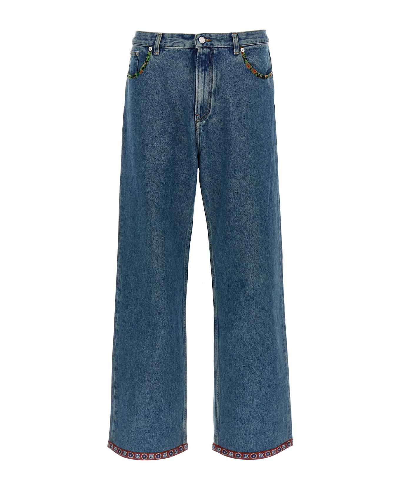 Cotton denim jeans with floral print cotton inserts, front zip and button closure, five pockets, straight leg, leather logo label at the back. Composition: 100% polyamide Made in: Italy Color: Blue Size and fit: - true to size fit Model number: V3DE04RB0W558