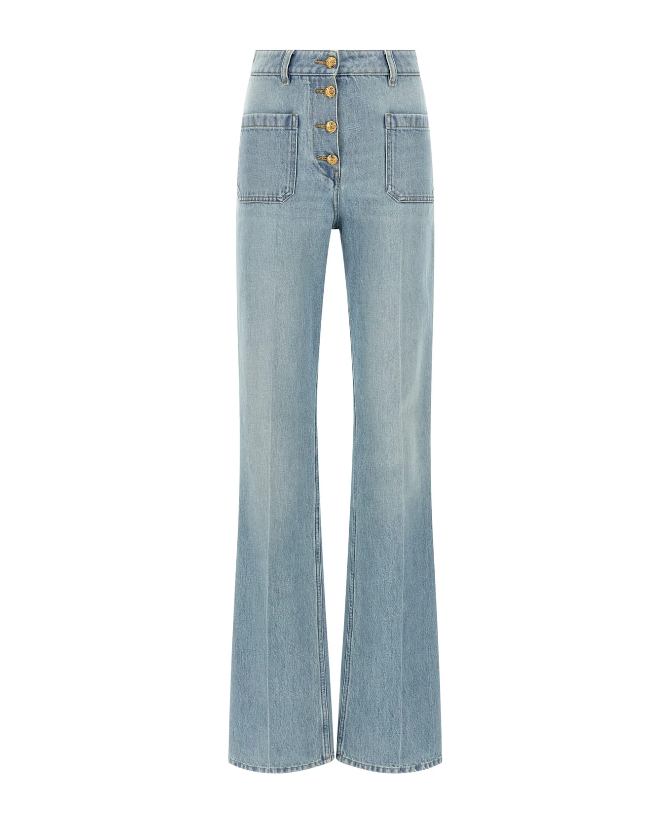 Stone-washed cotton denim jeans with contrast stitching, high waist, straight leg, stretched pleat, metal button closure engraved with front crest, patch pockets, back leather logo tag. Composition: 100% cotton Made in: Italy Color: Light Blue Size and fit: - true to size fit Model number: B0DD23LA92FLX