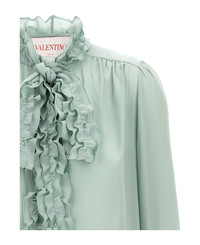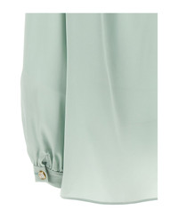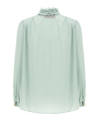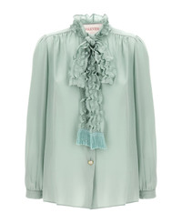 Silk crepe de Chine shirt with lavalliere collar, ruffled sash and fringes on the hem, jewel button closure, long cuffed sleeves. Composition: 100% silk Made in: Italy Color: Green Size and fit: - true to size fit Model number: B3AB77590FR5F