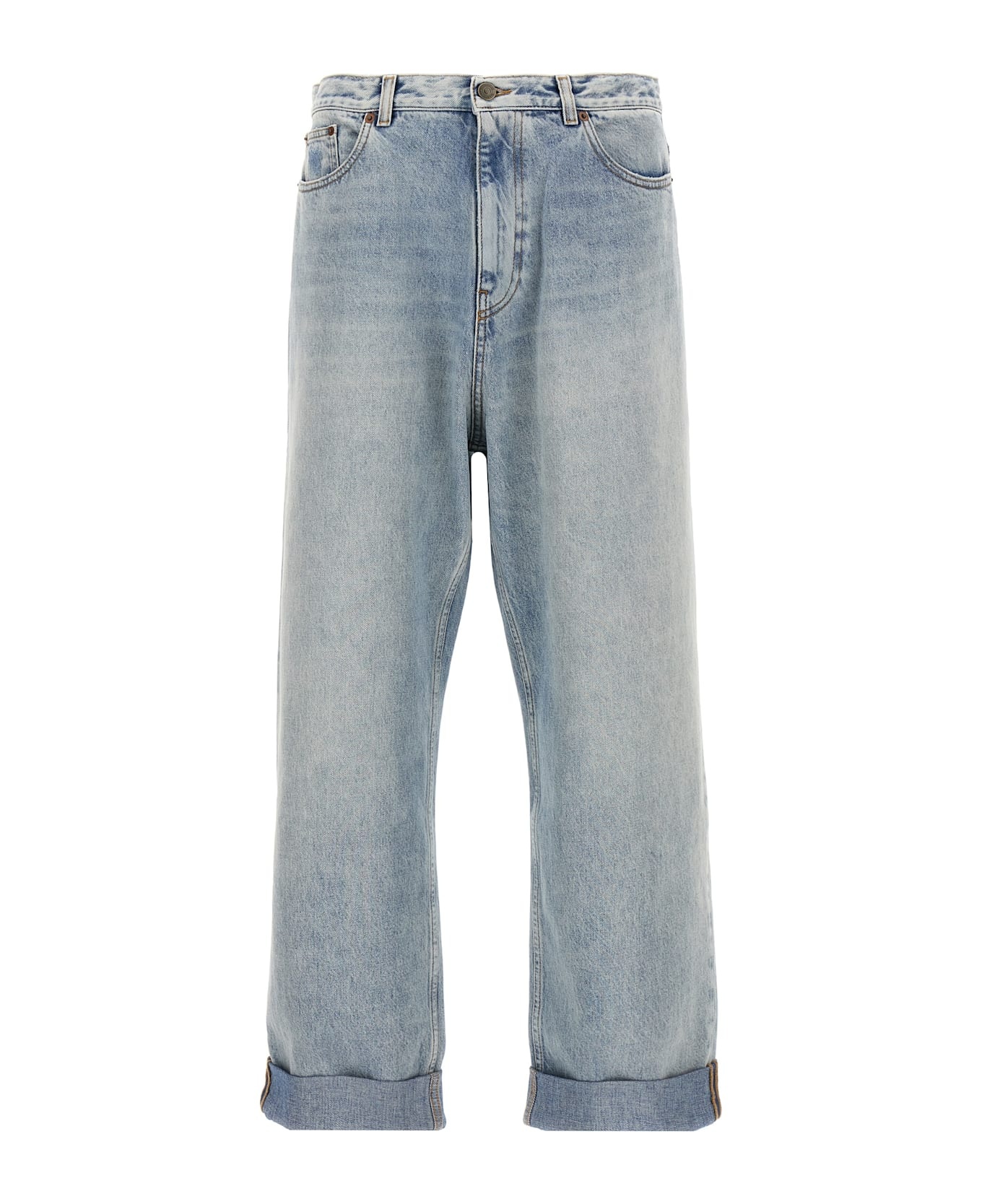 Delave high waist five-pocket cotton denim jeans with wide, straight leg, zip and button closure, turn-up leg bottoms, back leather logo tag. Composition: 100% cotton Made in: Italy Color: Light Blue Size and fit: - true to size fit Model number: V3DE04GARE508
