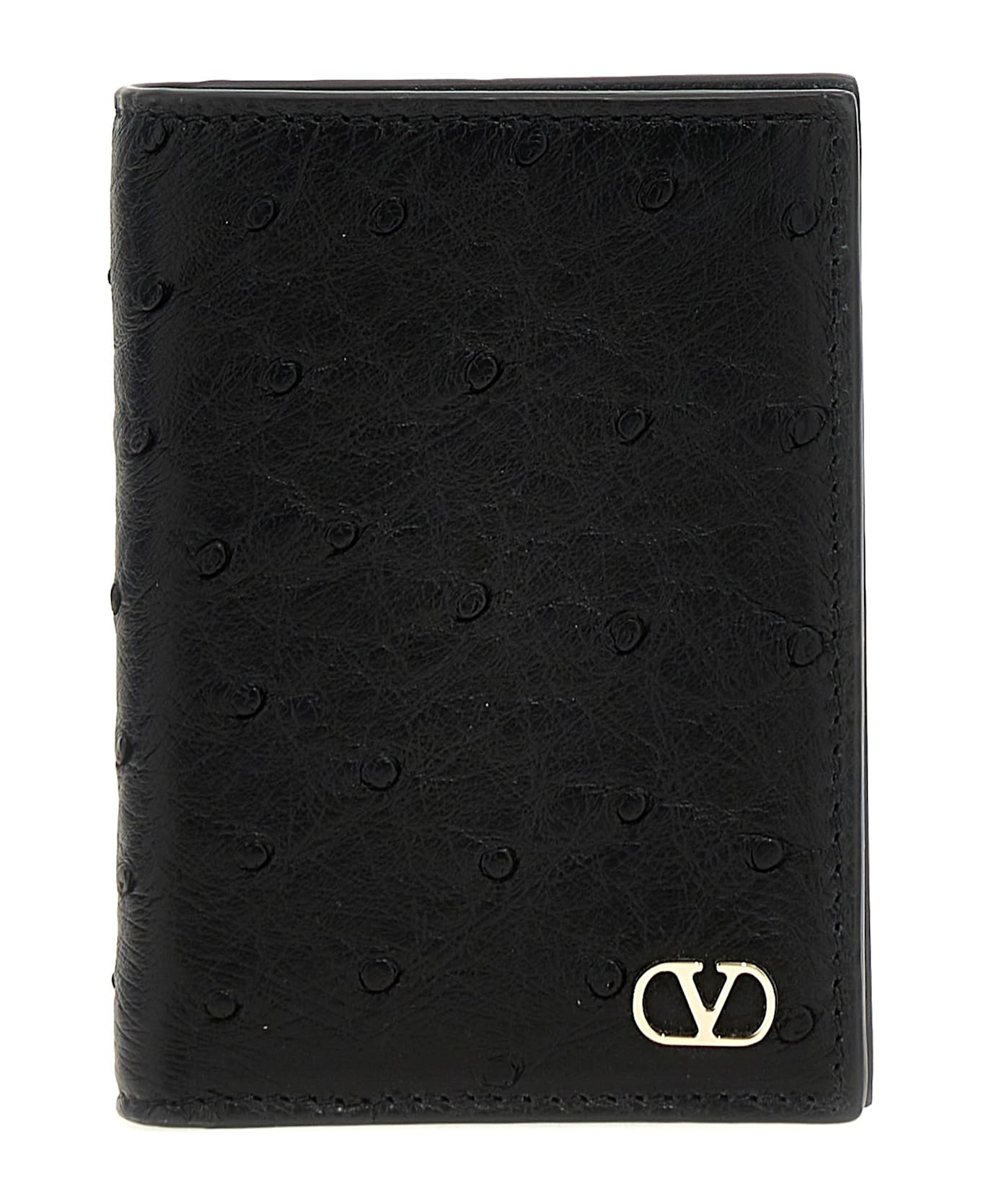Ostrich leather card holder, metal 'VLogo Signature' on the front, book opening. Composition: 100% ostrich leather Made in: Italy Color: Black Size and fit: - W 8 x H 11.5 x D 2 cm Model number: Y2P0V06RJA0NO