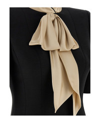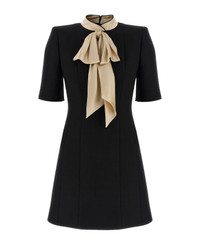 Virgin wool mini dress with hourglass silhouette, front and back pincer, high neck and contrast silk bow detail, short sleeves with padded shoulder straps, back zip closure, monogram lining. Composition: 65% virgin wool 35% silk Made in: Italy Color: Black Size and fit: - true to size fit Model number: B0VAGH61CFCFD