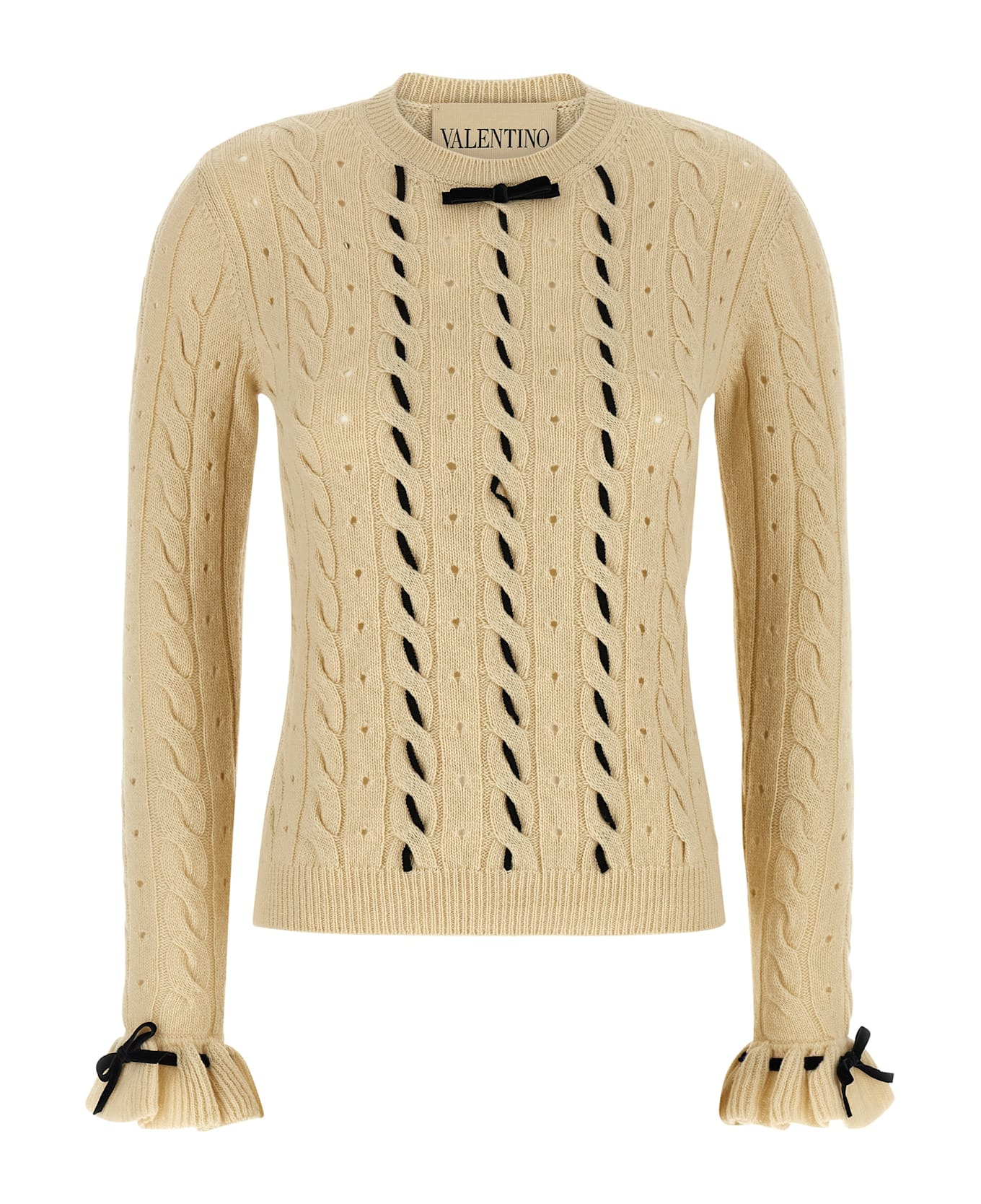 Braided wool sweater with velvet bow crewneck, grosgrain ribbon details, long sleeves with bow on the cuffs. Composition: 100% virgin wool Made in: Italy Color: White Size and fit: - True to size fit Model number: B3KC66Z9K9ET5