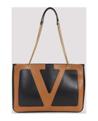Valentino Garavani Black Lambskin Leather Viva Superstar Medium Tote Bag. Pure black lambskin leather bag, top gold-tone chain shoulder straps with black leather details, front contrasting brown signature logo, back zipped pocket, one main compartment. Gold-tone hardware. Made in: Italy Color: BLACK/BROWN Size and fit: - W:37cm H:26cm D:3cm Model number: 7Y2B0R13PTJRFA