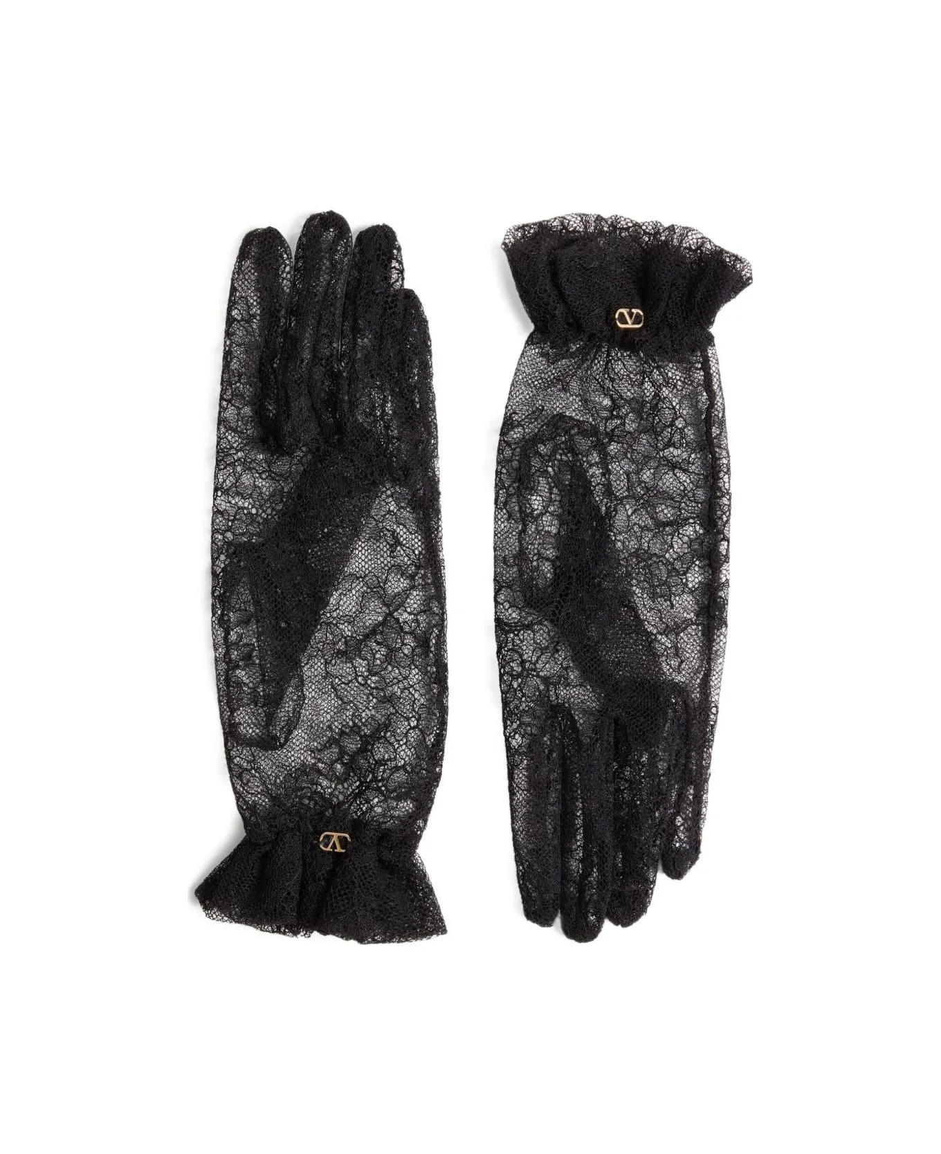black intricate lace design ruffled cuff detailing logo embellishment fingertip coverage Composition: Viscose, 39% , Polyamide, 61% Made in: European Union Color: Black Model number: WGD00FYCCN06
