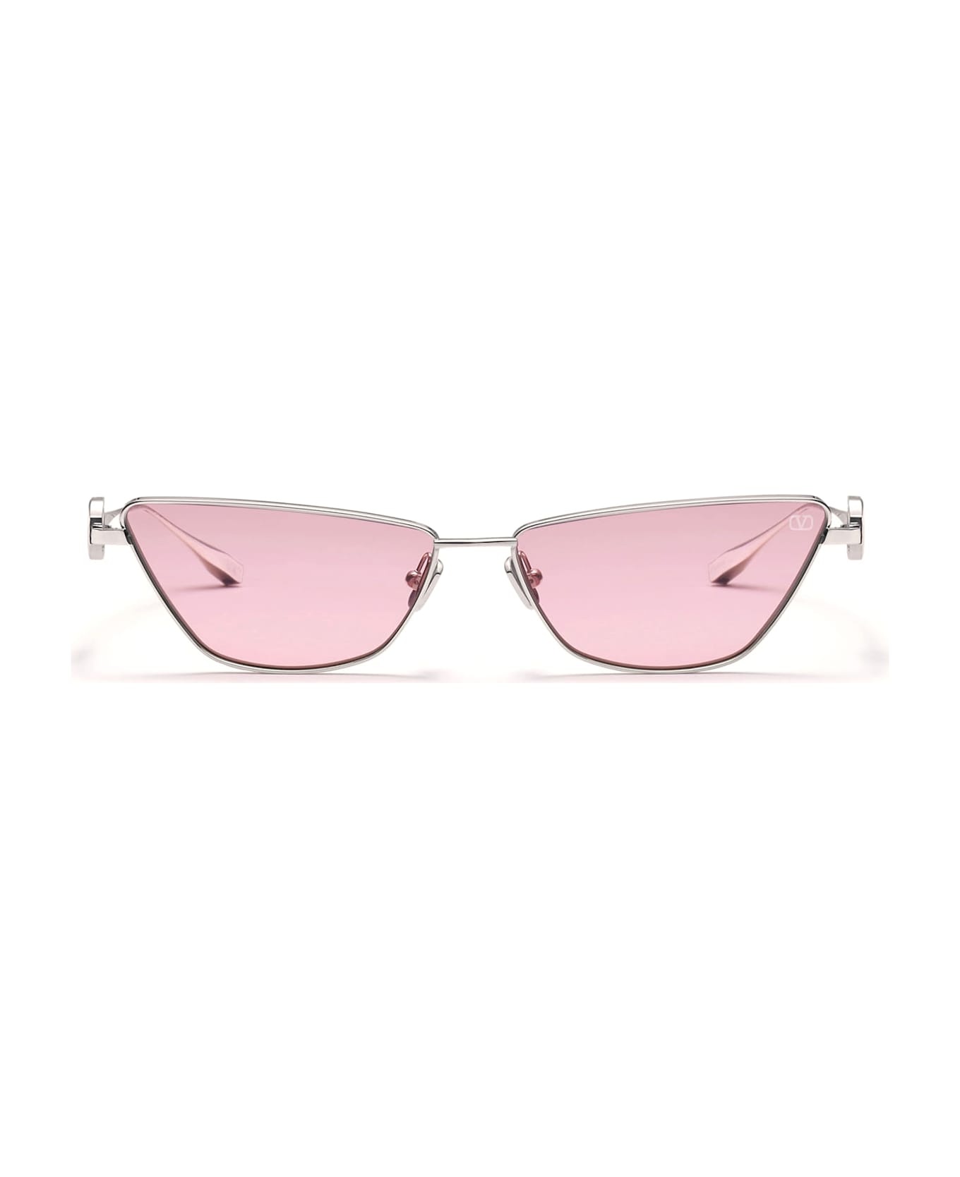 Valentino VLOGO SIGN - SILVER (VLS-135C-61) are feminine '90s-inspired low-profile cat-eye sunglasses, a modern interpretation of La Dolce Vita style. They feature silver Japanese titanium frame, custom temples with Valentino iconic logo and custom extruded tridimensional rockstud-inspired temple tips, burgundy lens with 100% UV protection. Made in Japan - Color: silver - Material: titanium - Lens: burgundy - Shape: cat-eye - Size: eye 61mm / bridge 15mm / temple 143mm Made in: Japan Color: Silver Model number: VLS135C61