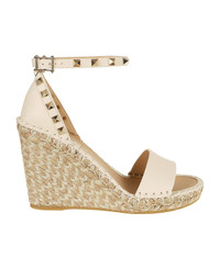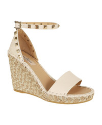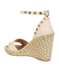 Rockstud Double wedge in Moose-print calfskin by VALENTINO GARAVANI. Closure with tone-on-tone ankle strap, embellished with platinum-colored studs. Featuring a rope-covered wedge. Made in: Italy Color: NEUTRALS Size and fit: - Heel 10,5 cm Model number: 7W2S0090FEQ48N