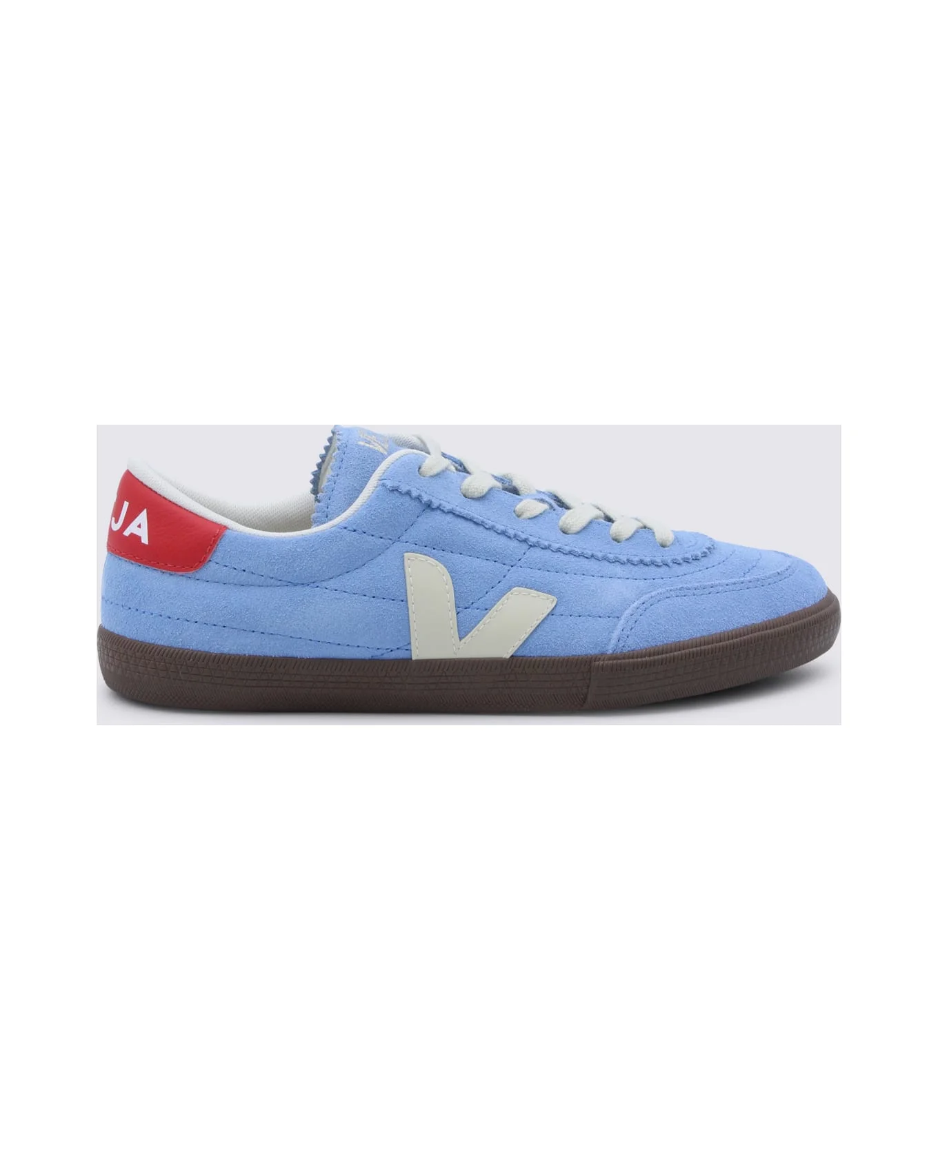 Azure and white leather Panenka sneakers from Veja featuring round toe, cotton lace. up fastening, lateral V patch, red heel tab, impunctures and rubber sole. Composition: _cover Tex/le Sole, 100% Elastodiene Made in: Brazil Color: AQUA_PIERRE_BARK Model number: FU0321389A