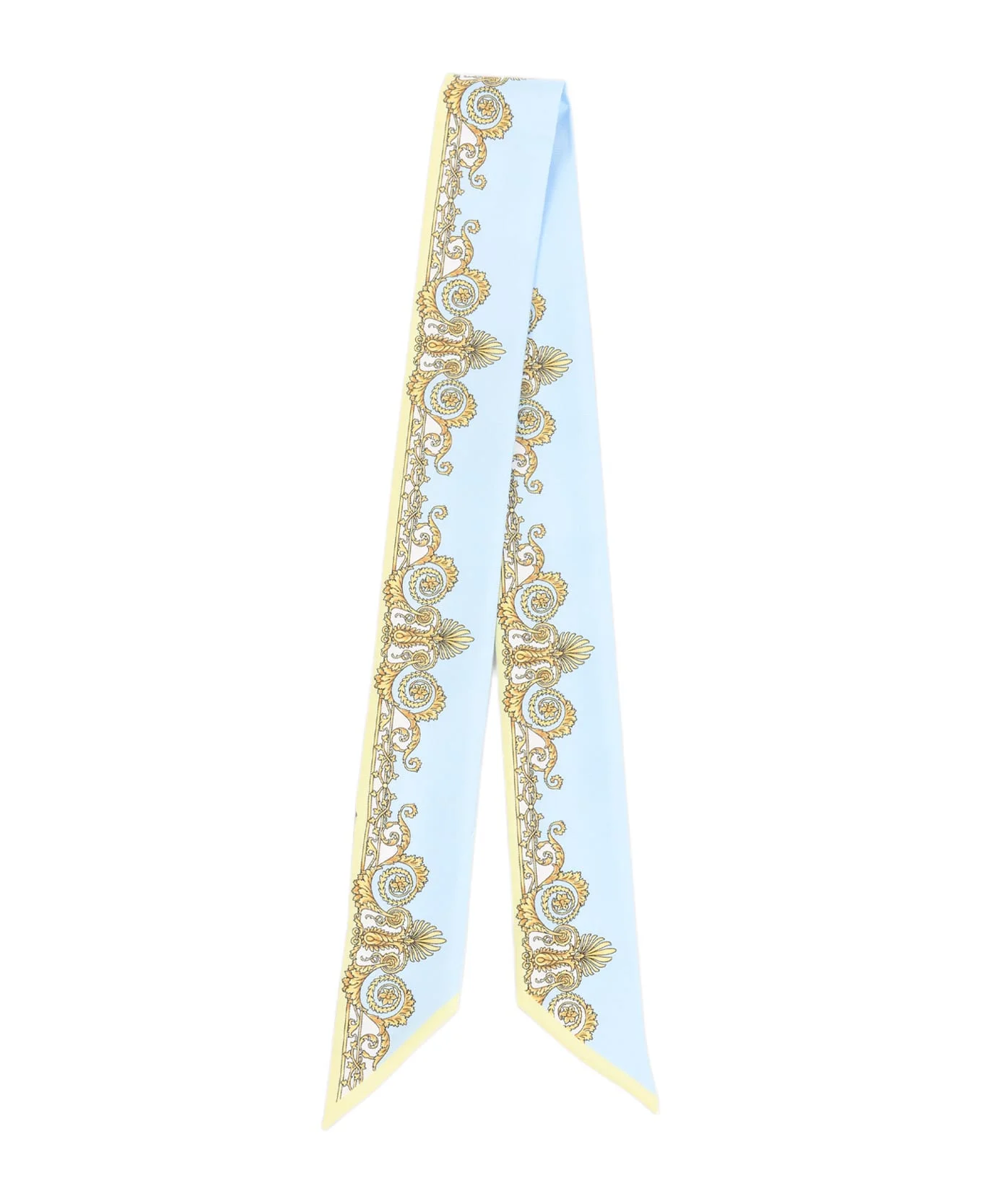 Versace Pale Yellow Silk 5X86 Bandeaux Foulards. Pure silk foulard, blue background, pale yellow edges, yellow and rose quartz signature flower design, asymmetric hem. Made in: Italy Color: Pale Yellow Rose Quartz Size and fit: - 5cm X 86cm Model number: IBA00051A170595Y590