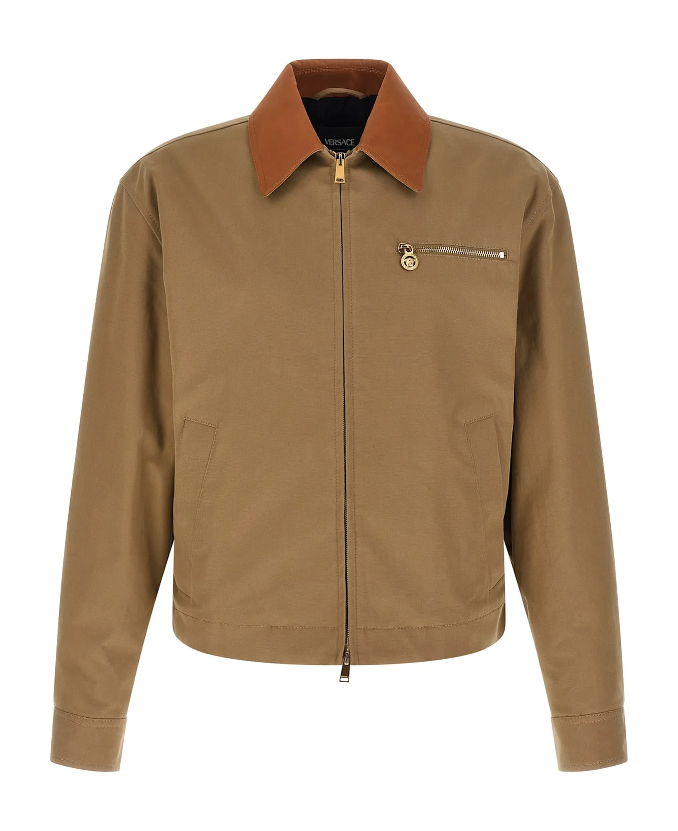 Canvas jacket with leather-covered collar, front metal zip closure, zipped pocket, long sleeves with cuffs and logo buttons. Composition: 100% cotton Made in: Italy Color: Beige Size and fit: - True to size fit Model number: 10222441A168021KM00