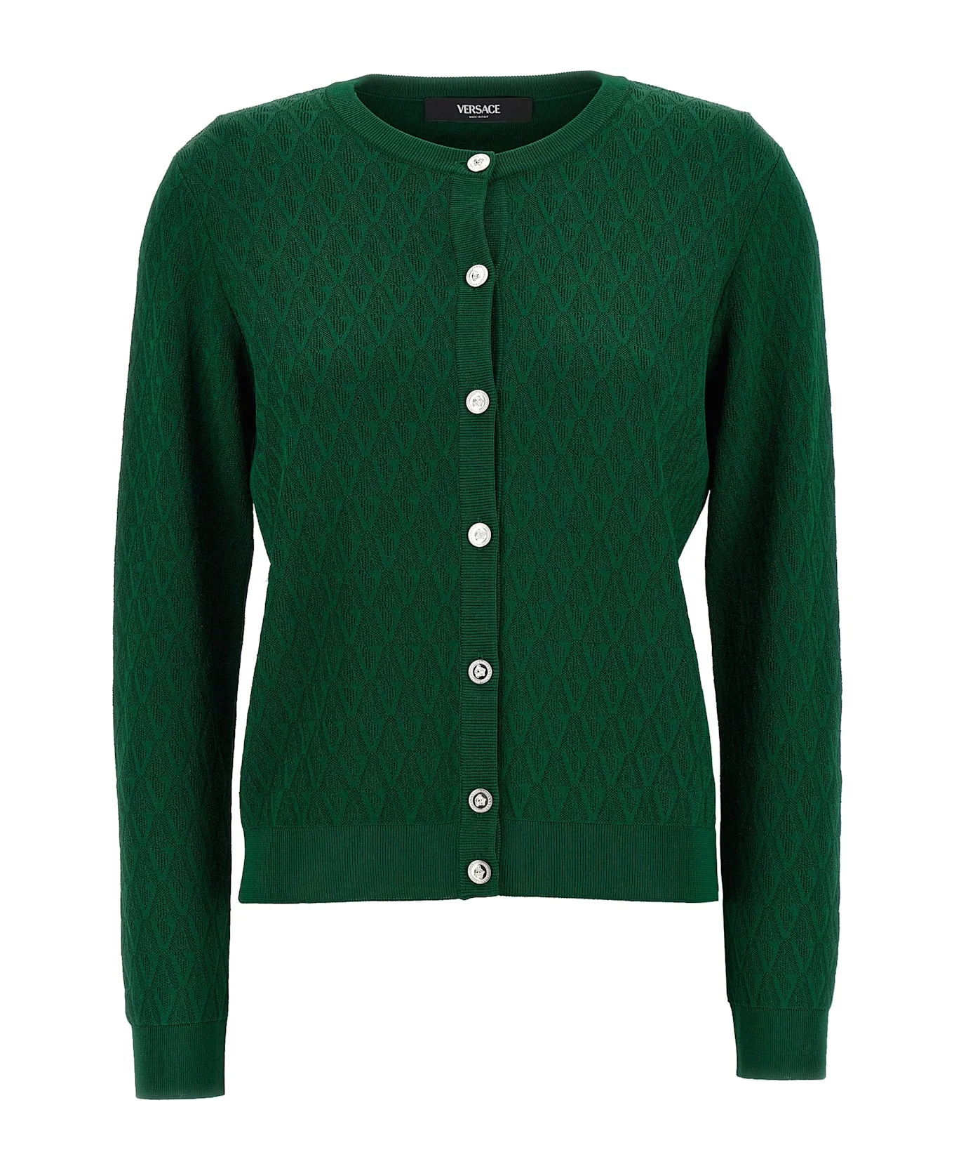 Stretch viscose cardigan with all-over V-pattern in tone-on-tone jacquard knit, crew neck, front metal 'Medusa' button closure, long cuffed sleeves. Composition: 91% viscose 7% nylon 2% elastane Made in: Italy Color: Green Size and fit: - Slim fit Model number: 10230141A159781GQ50