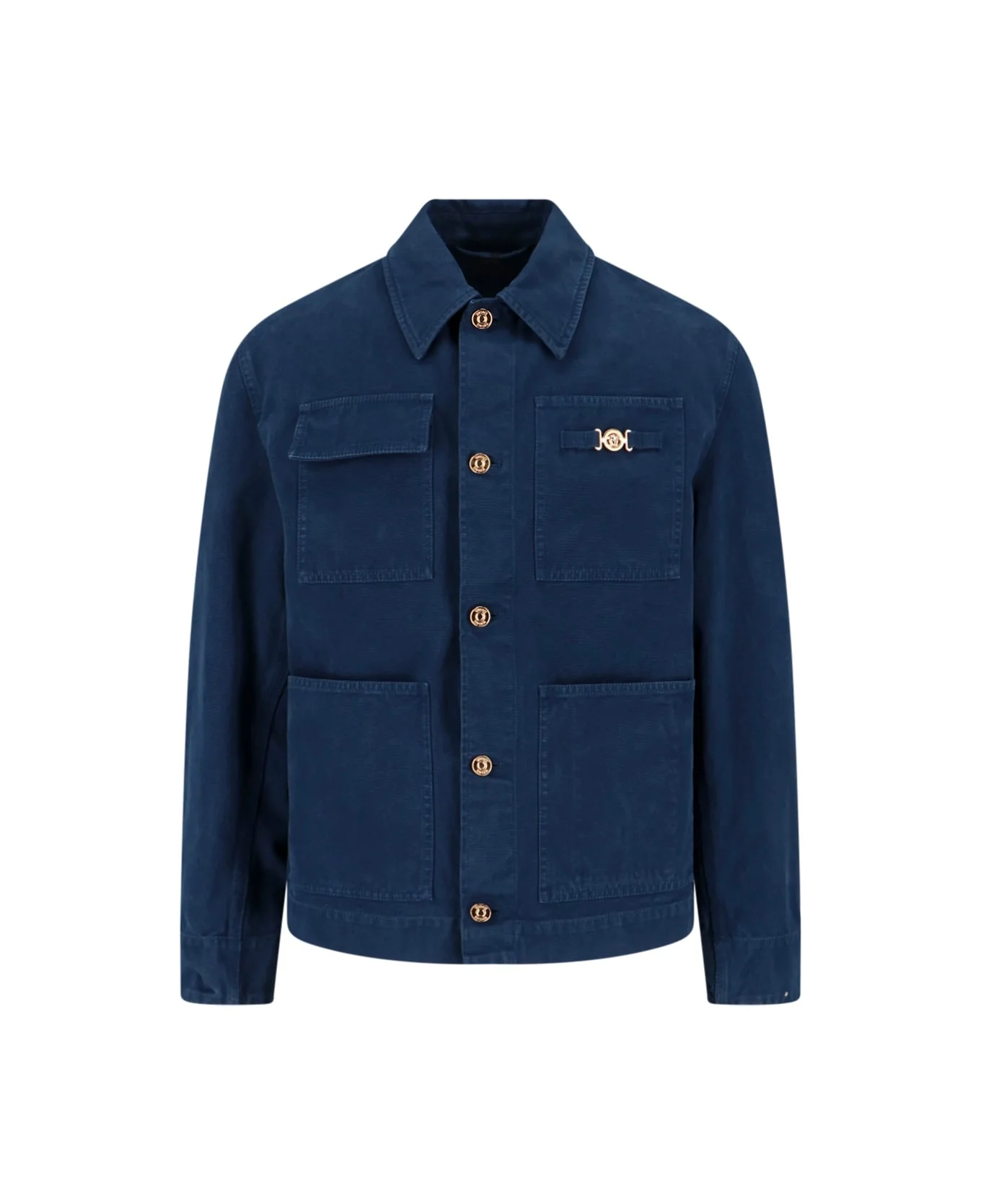 Versace Carpenter blue cotton jacket with classic collar, button closure, long sleeves, four front pockets, one flap, gold metal 'Medusa' detail on the front, button cuffs and waist, curved hem. Composition: 100% Cotton Made in: Italy Color: Blue Size and fit: - Vestibilita regolare Model number: 10178591A129461UO60