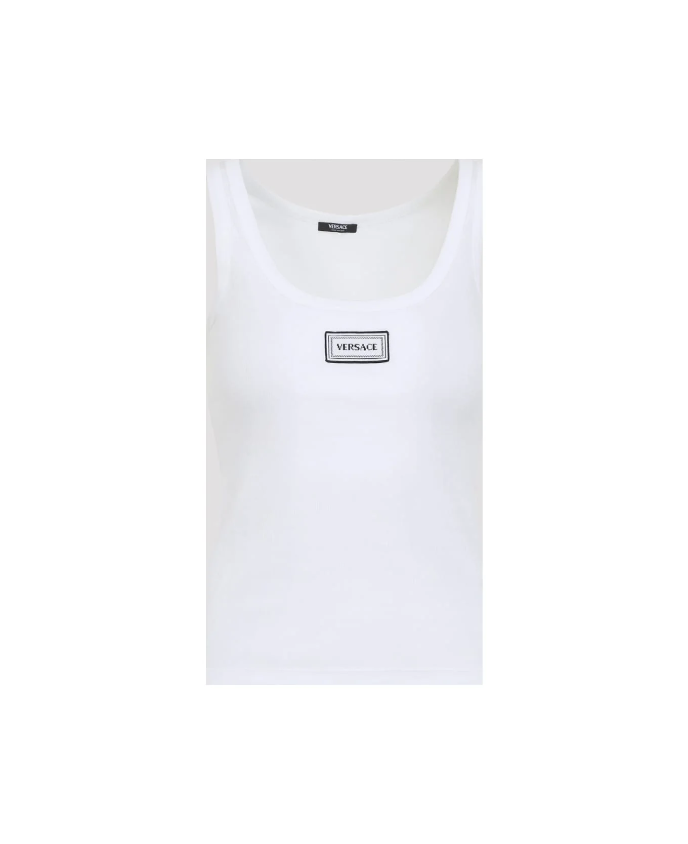 Versace White Cotton Tank Top. Crafted from white stretch ribbed cotton, it features a sleeveless construction, an open round neckline, an embroidered logo patch on the front, a straight hem, and a slim fit. Made in: Italy Color: Optical White Model number: 10232101A172221W000