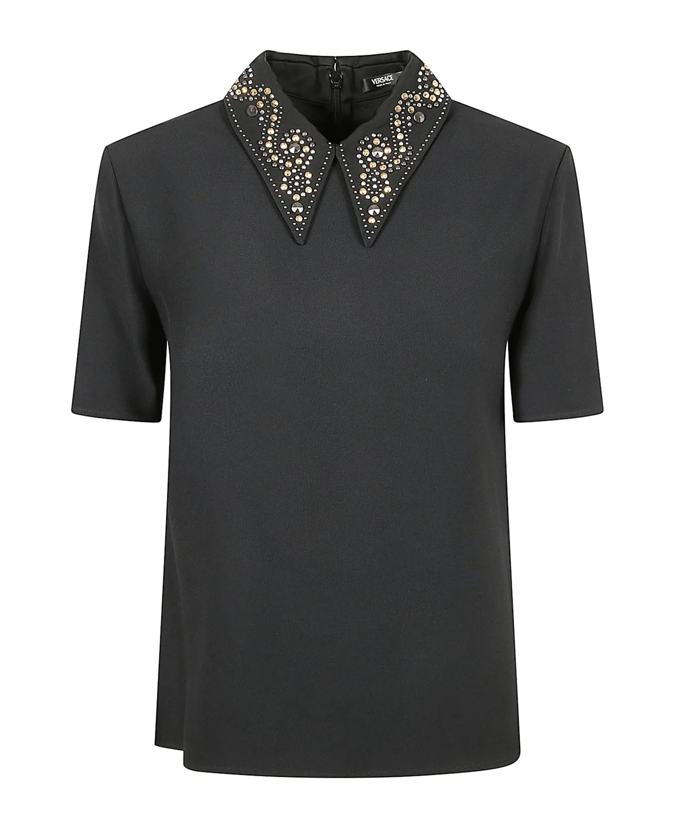 Short-sleeved satin top with renvers. Studded details on the pointed collar. Concealed back zip closure. Composition: 74% Acetate, 26% Viscose Made in: Italy Color: Black Model number: 10221201A123691B000