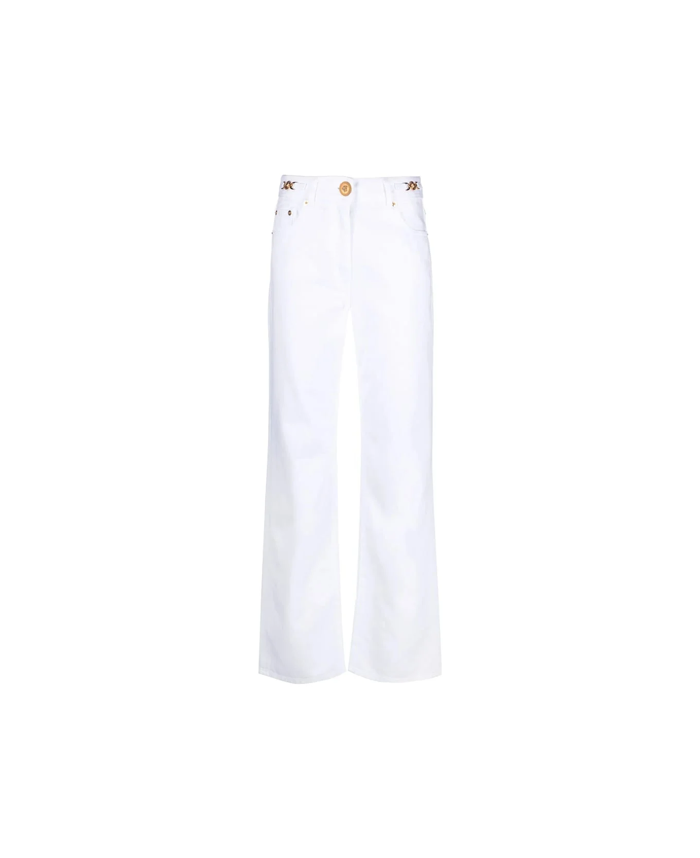 white cotton denim stonewashed Medusa '95 plaque detail logo-embossed patch to the rear belt loops front button and zip fastening logo-embossed button straight leg classic five pockets gold-tone hardware authenticity QR code Made in: Italy Color: WHITE Model number: 1A085701013745
