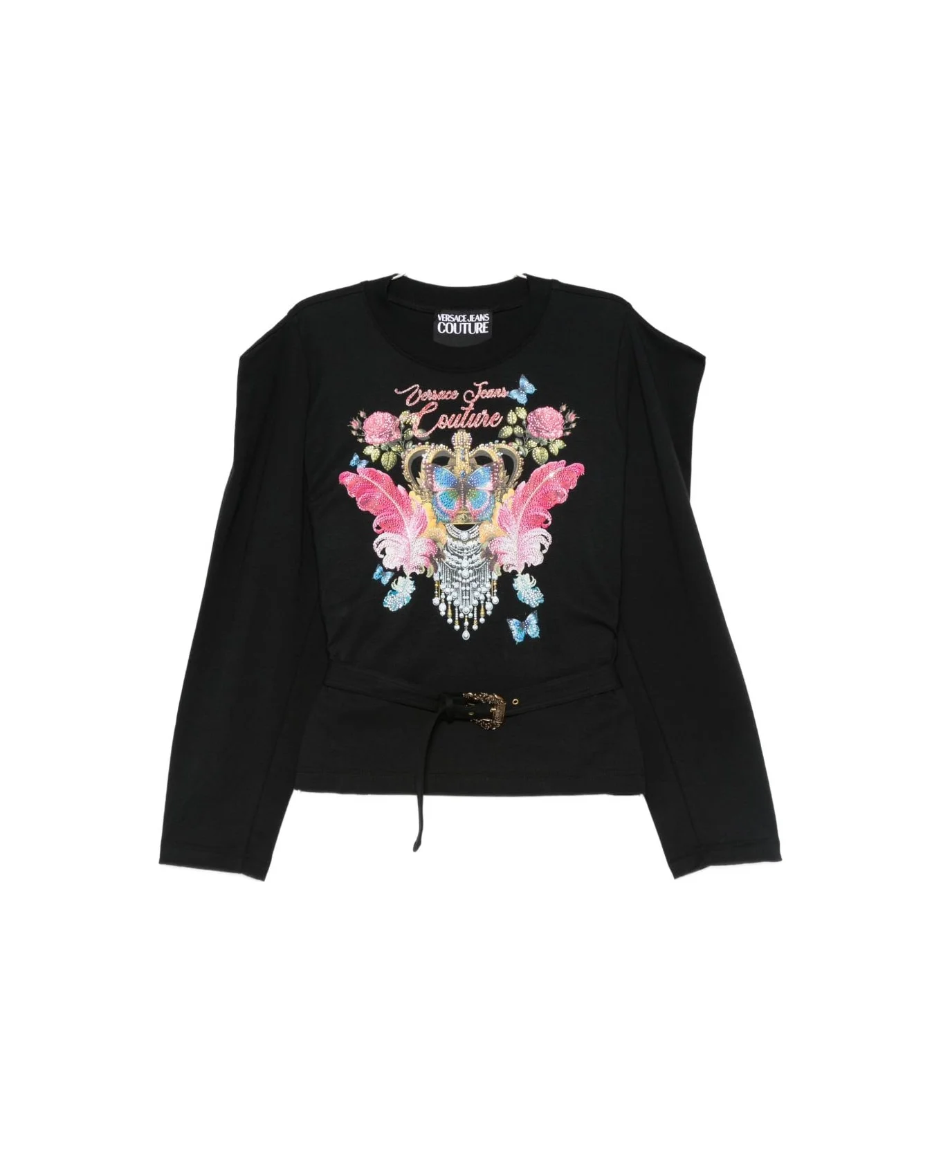 Versace Jeans Couture Embellished Top Features Black Crown decoration Butterfly motif Feather detail Encrusted design Knotted belt Composition 100% cotton Color: Black Model number: 79HAHE03CJ01E899