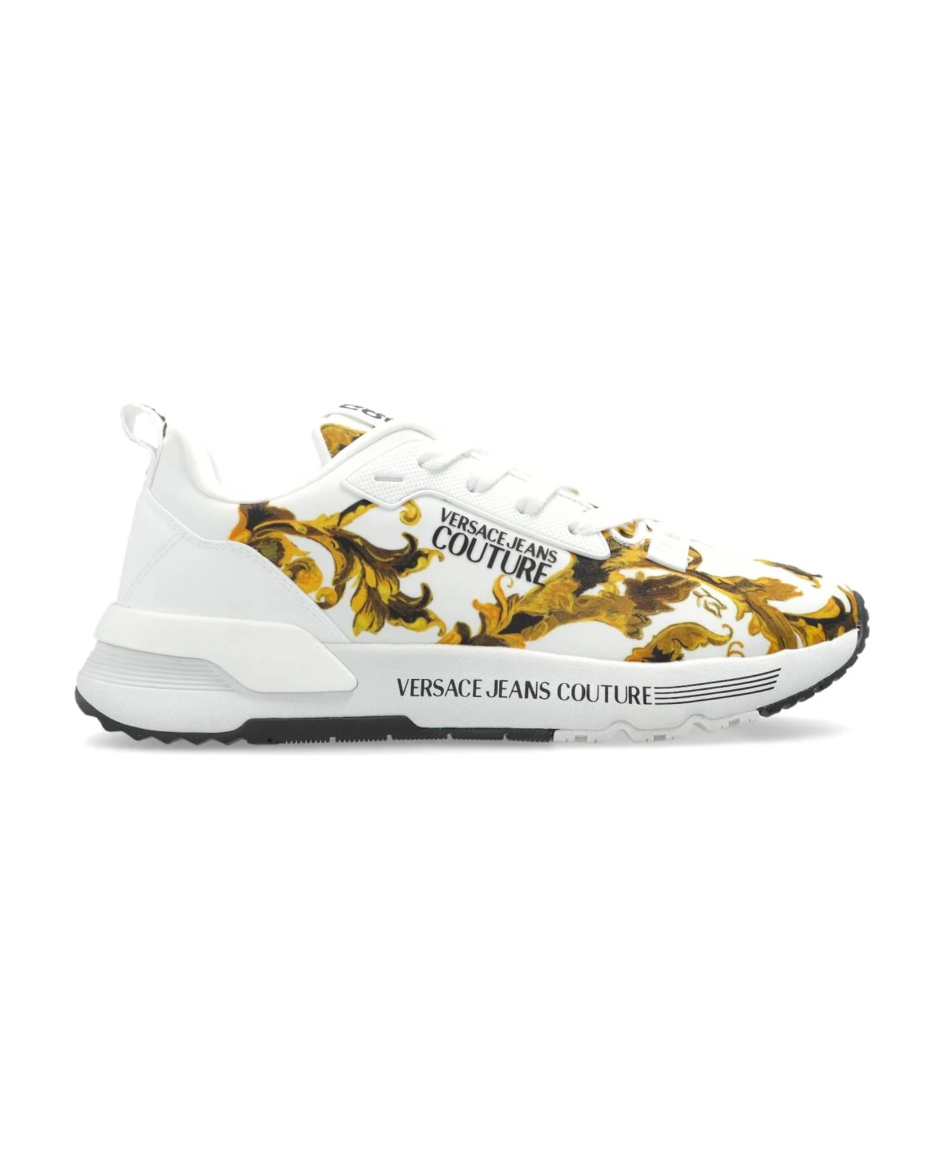 Immerse yourself in the remarkable artistry of Versace Jeans Couture with these Barocco Print Low-Top Sneakers. Designed in a distinguished low-profile silhouette, these sneakers captivate with an eye-catching barocco motif a lavish dance of gold and brown botanical ornaments set against pristine white. The beautifully rounded forefront is complemented by a sculpted, substantial outsole with a prominent tread, ensuring sophisticated style paired with everyday comfort. The upper is expertly crafted from smooth, lustrous synthetic or leather-like material, offering both modern clarity and lasting elegance. Signature contrasts include the instantly recognizable VERSACE JEANS COUTURE logo emblazoned on the side and echoed on the sole, attesting to their exclusive heritage. These sneakers embody the innovative spirit at the intersection of high-fashion and contemporary street style. Why choose this product? Iconic barocco print for a statement look Meticulously crafted with premium modern materials Distinctive branding highlights unique designer heritage Low-top silhouette pairs versatility with elegance Exceptional comfort with a supportive, robust sole Composition: Inner Layer: 100% Fabric Outer Layer: 100% Fabric Sole: 100% Rubber Made in: China Color: WHITE Size and fit: - Sole Height at the highest point: 4,5cm Model number: 79VA3SAAZSC97