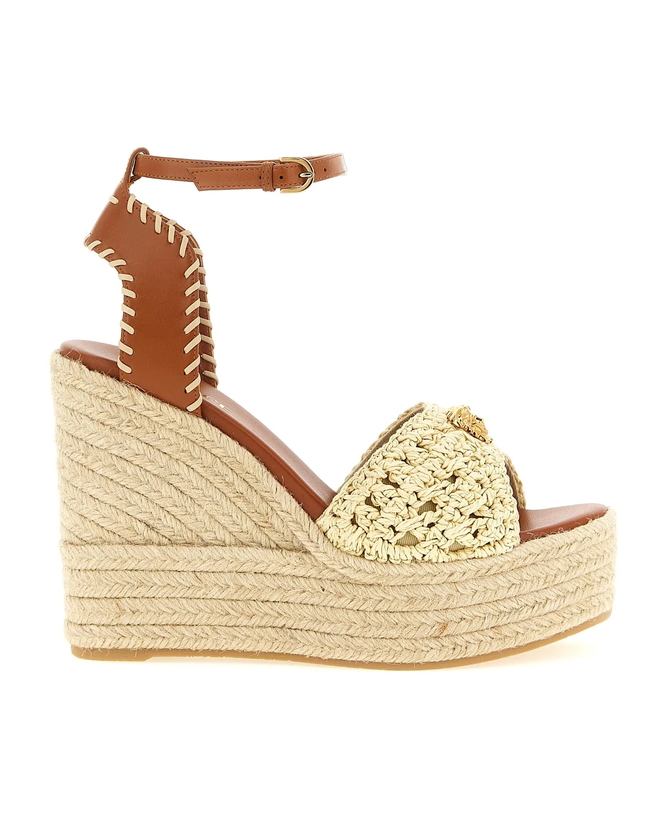 Leather espadrilles with contrasting weaves, woven raffia band with cotton canvas lining and metal 'La Medusa' logo on the front, adjustable ankle strap, woven rope wedge, rubber sole. Composition: 100% lamb leather (Ovis aries) Made in: Spain Color: Beige Size and fit: - EU WOMAN - Heel: 12 cm Model number: 10230741A170442KJ8V